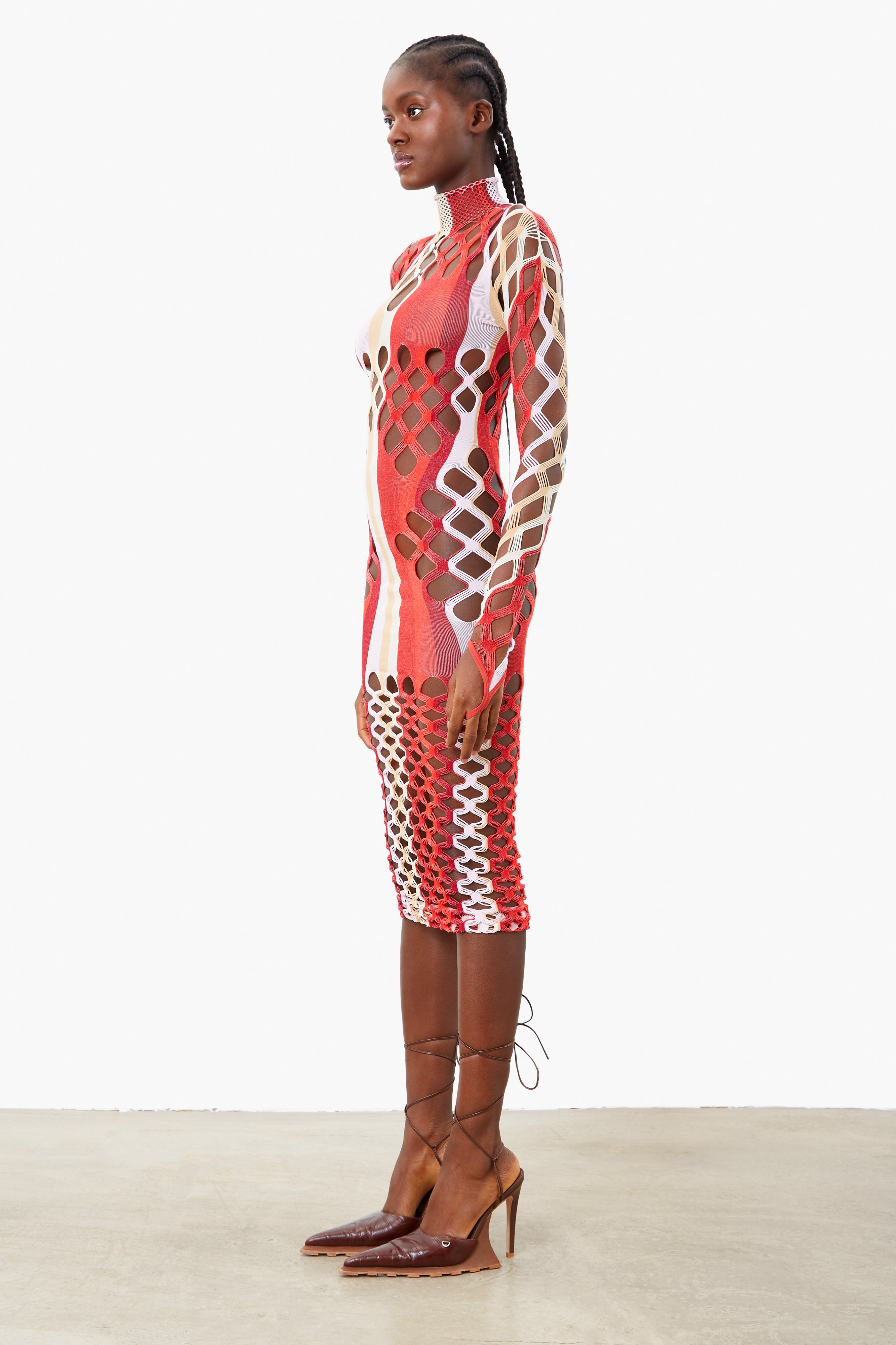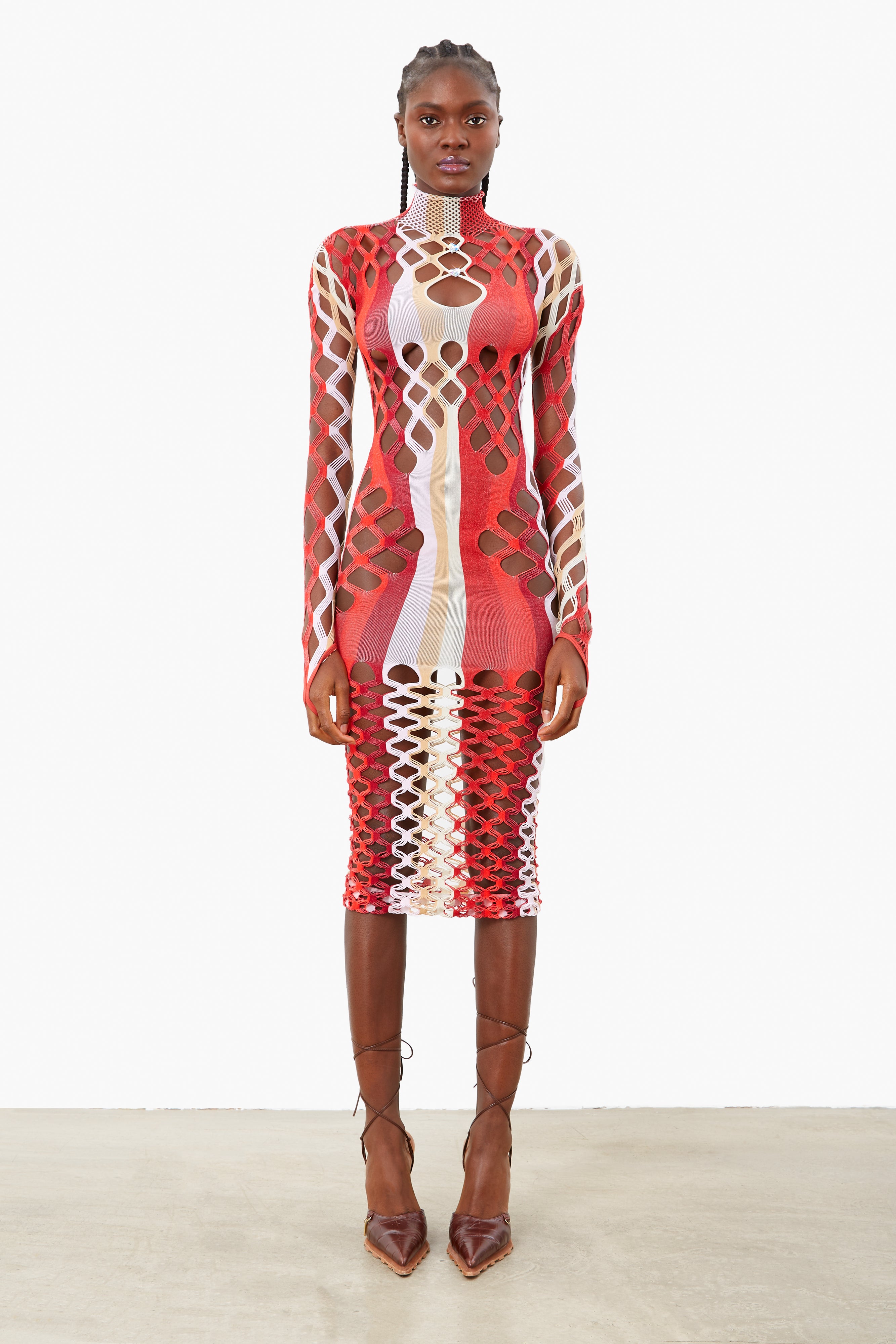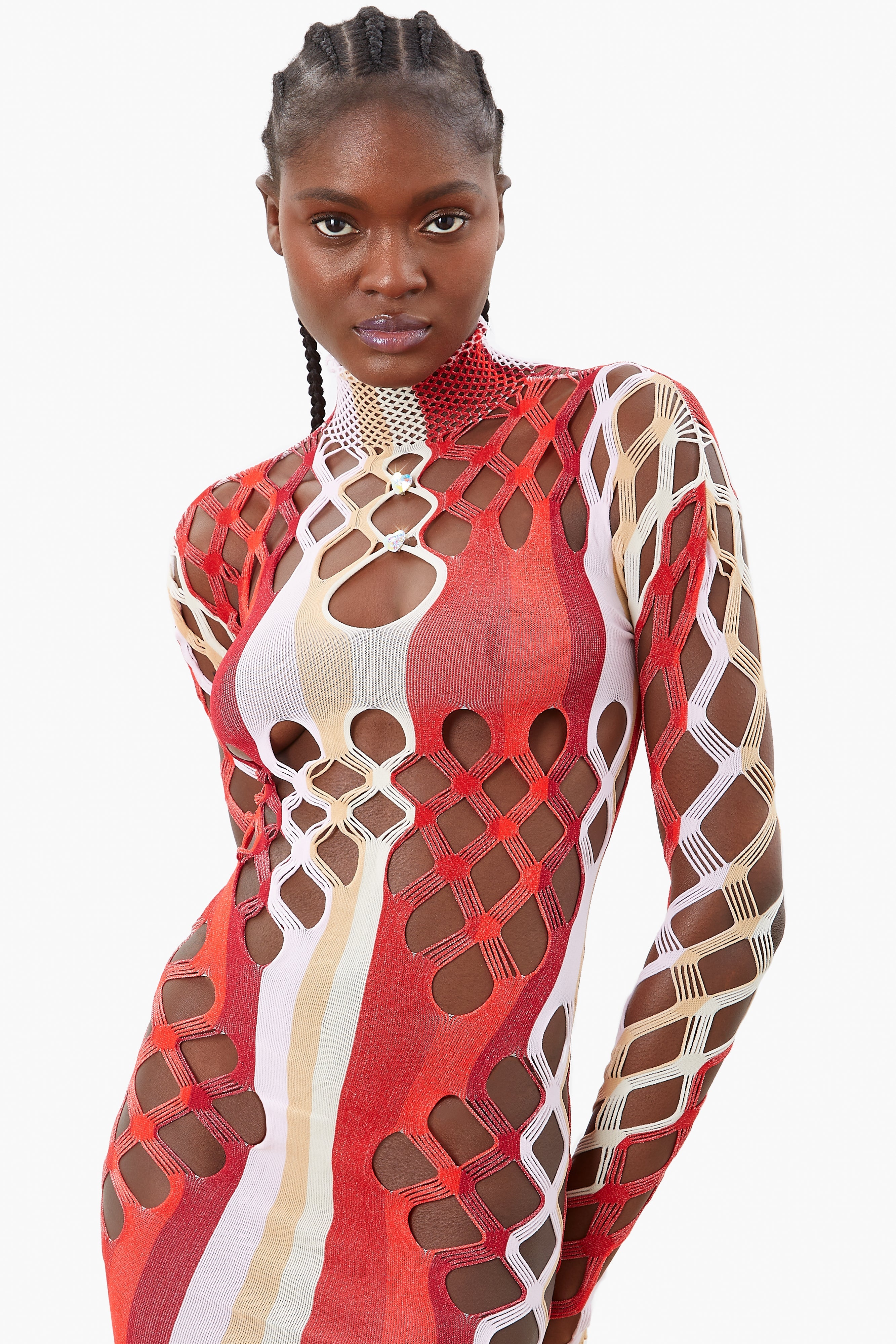 The Marina Dress is brand new for AW23. Featuring semi sheer stretch shapewear, hand dyed yarns blended together in Oyster and Burgundy stripe and our infamous diamond cut open weave lacing that contours every body to perfection.