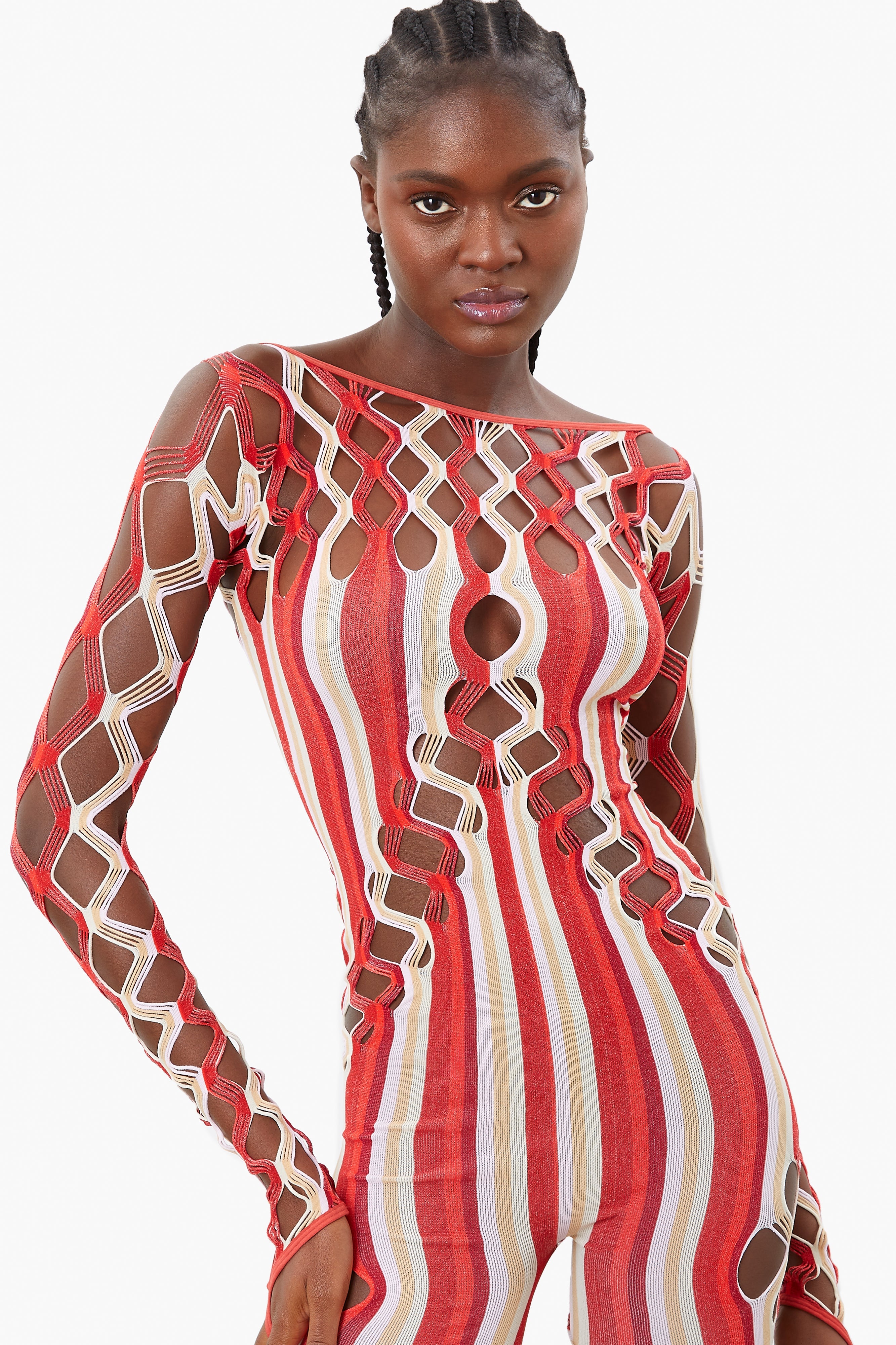 The Ripple Playsuit is brand new for AW23. Featuring our newly developed semi sheer shapewear, hand dyed yarns that blend together in Oyster and Burgundy stripe and our infamous diamond cut open weave lacing, contouring every body to perfection.