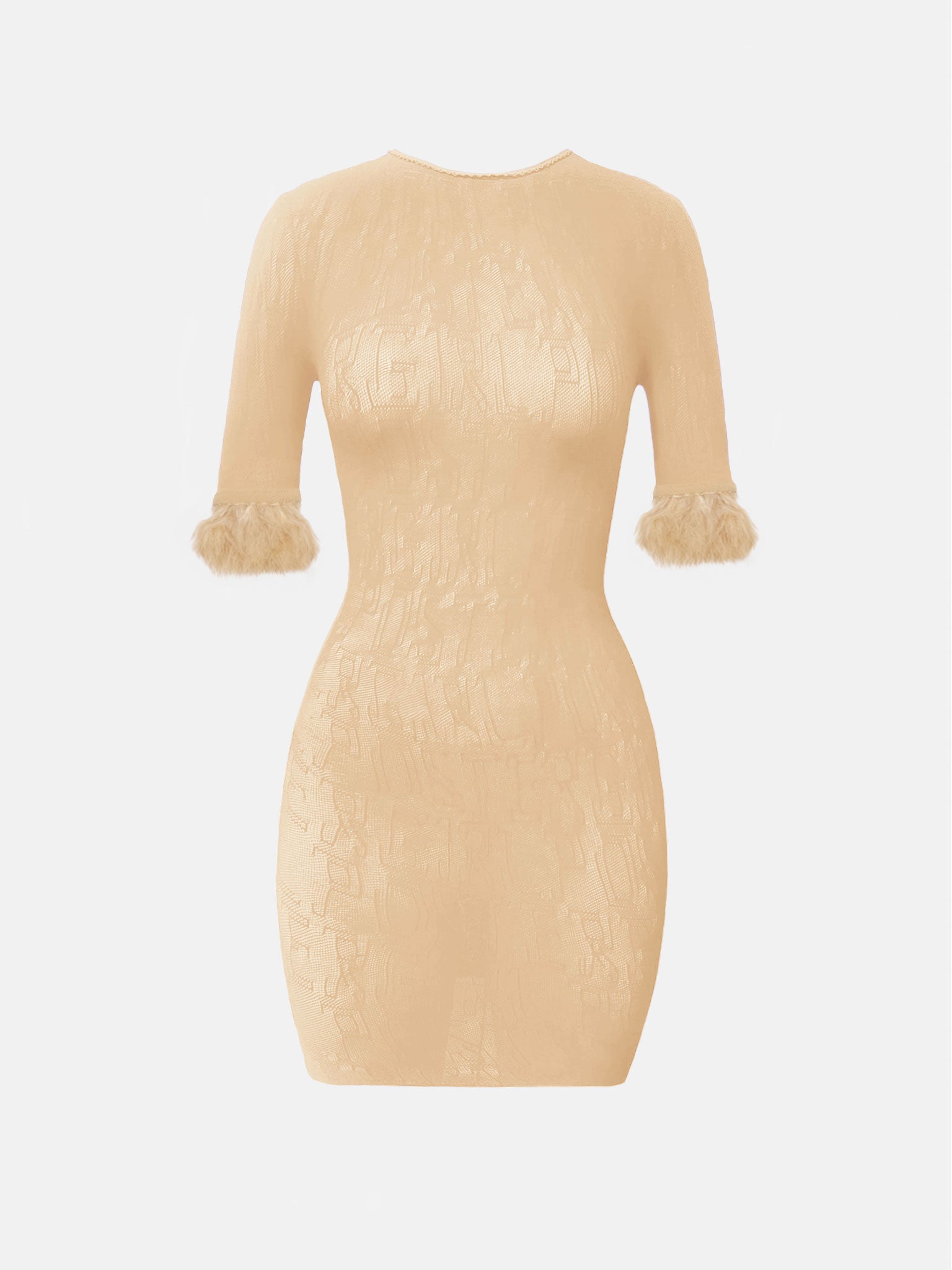 The Vanderpool Dress is cut from a delicate custom logo sheer beige lace. This figure skimming mini dress features marabou feather detailing on the sleeves and an adjustable lace-up back which can be altered to your desired fit.