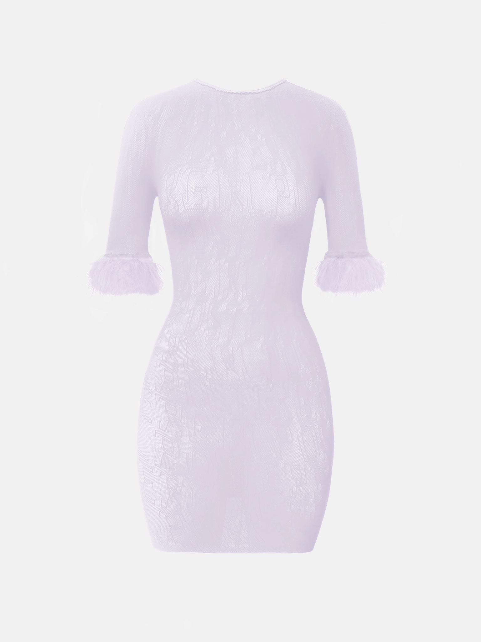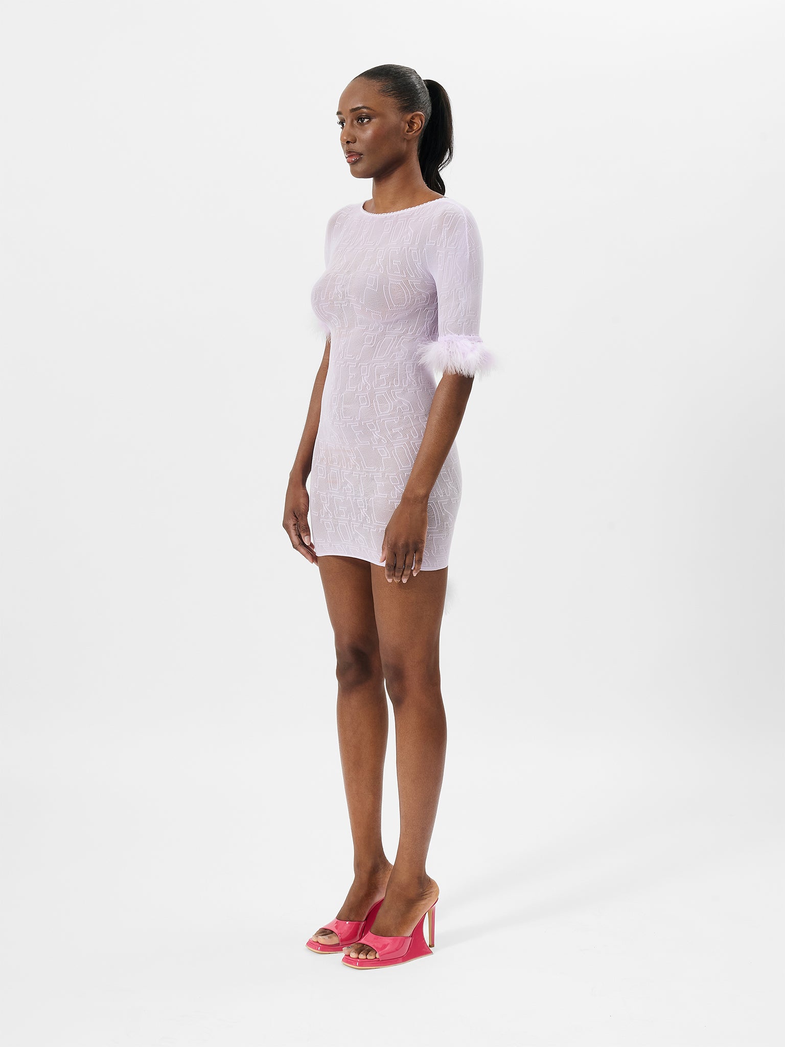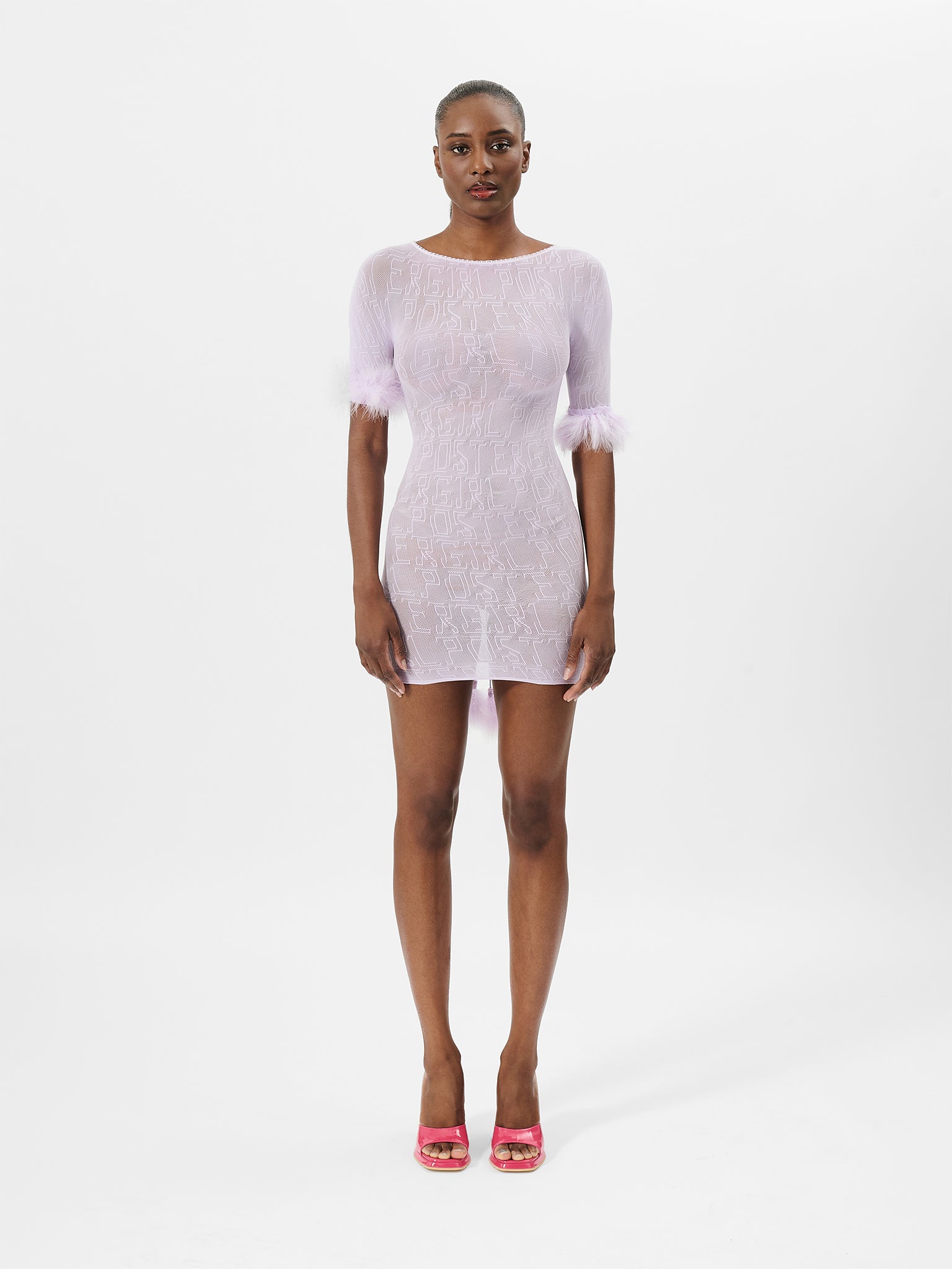 The Vanderpool Dress is cut from a delicate custom logo sheer lilac lace. This figure skimming mini dress features marabou feather detailing on the sleeves and an adjustable lace-up back which can be altered to your desired fit.