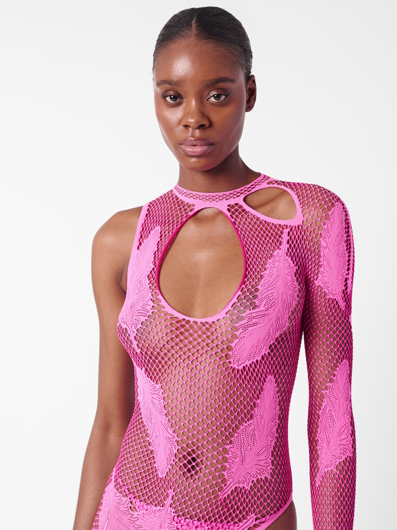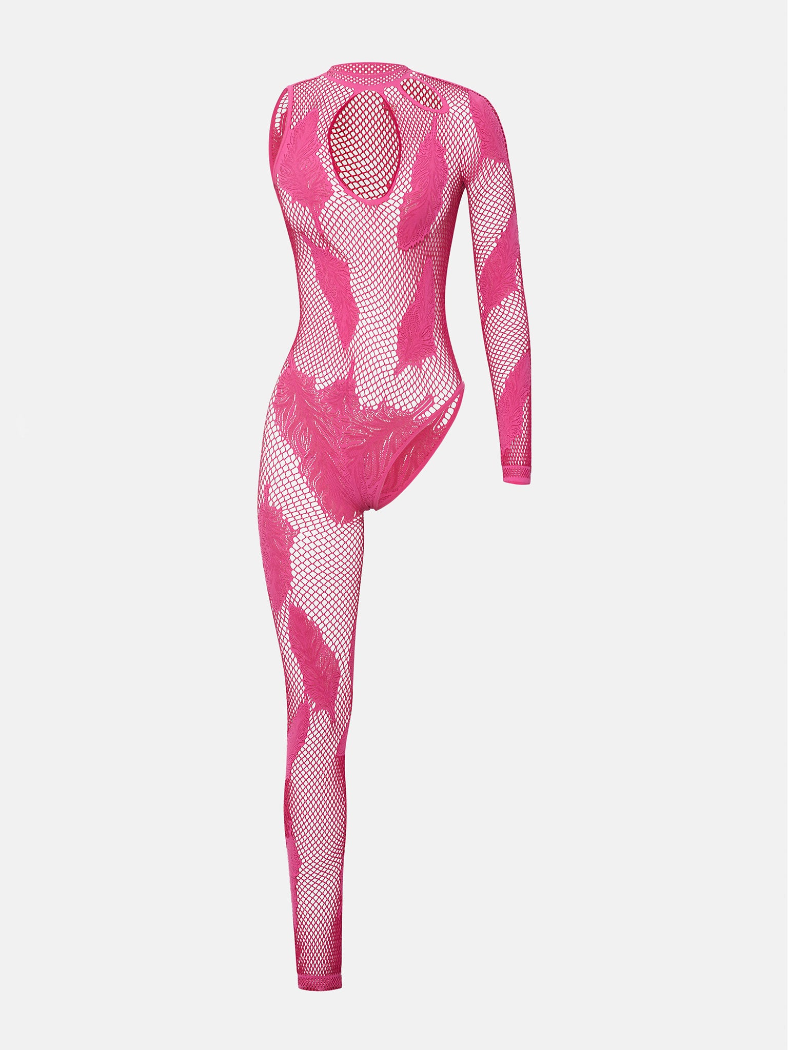 Our Leng Jumpsuit says it all in the name. The fishnet fabric and front cutouts will give a sneak peek of what's underneath. Designed with asymmetrical one-leg and feather details for a unique and bold finish. The back fastens with our signature heart buttons for a sculpted fit. Always remember, the brand logo is stamped into the lower back of all designs as POSTER GIRL's mark of authenticity.