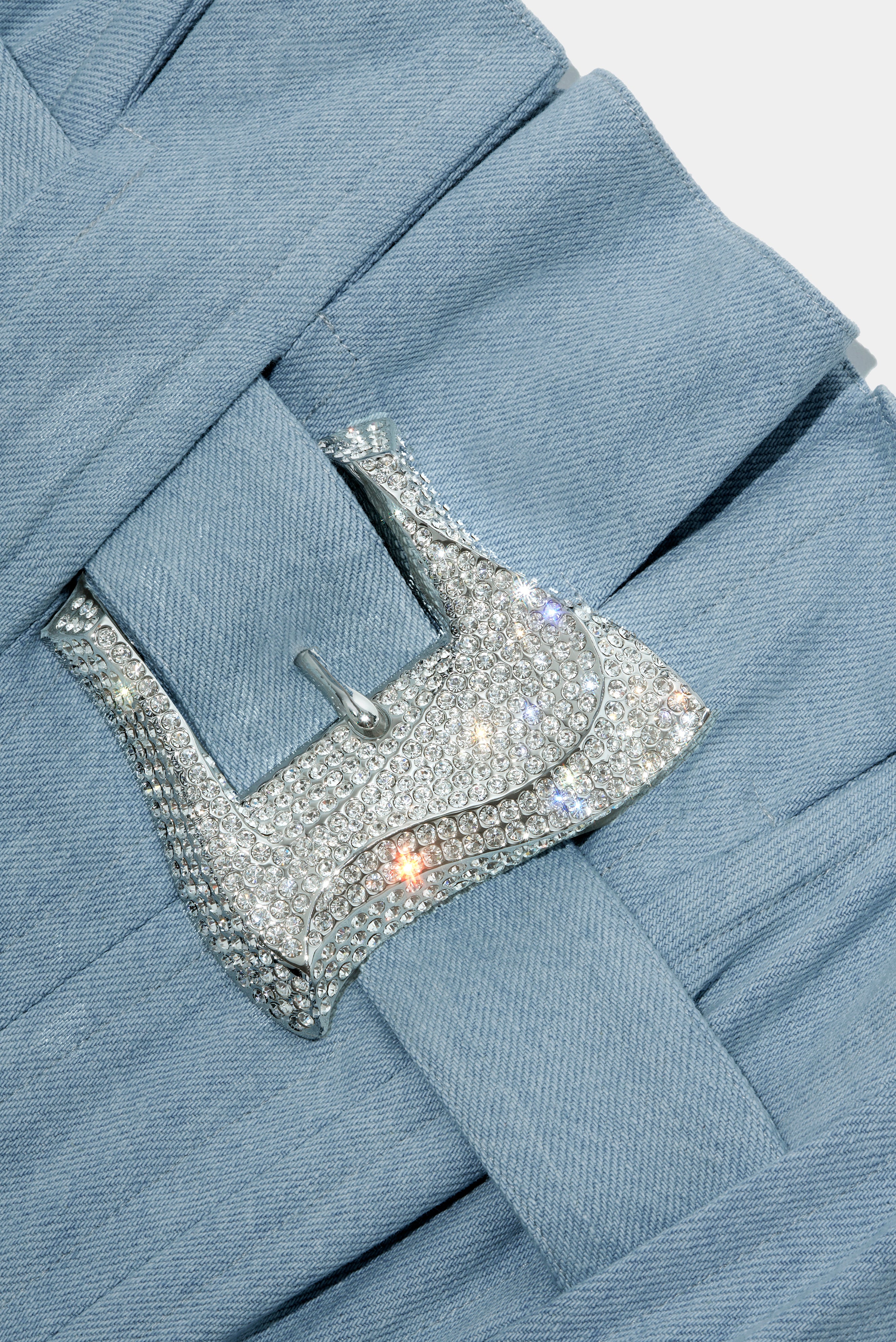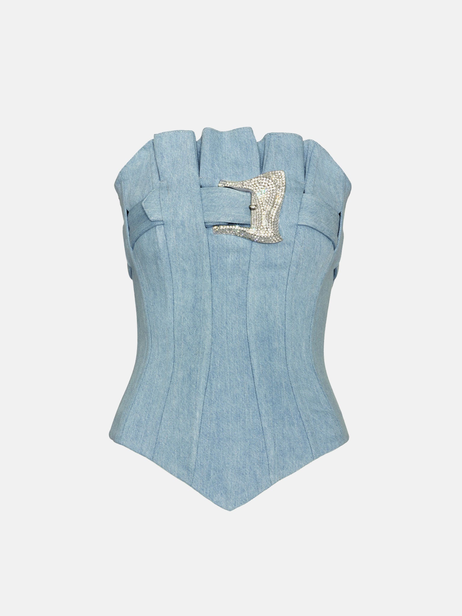 The Calamity Corset marks our denim debut. Crafted in London in luxurious light blue cotton, the denim corset features panelled pleating details, with silicon boning, that suction you in all the right places, highlighting your natural curves. Our iconic dazzling diamanté buckle secures the pleated panels weaving in and out of the top hem.