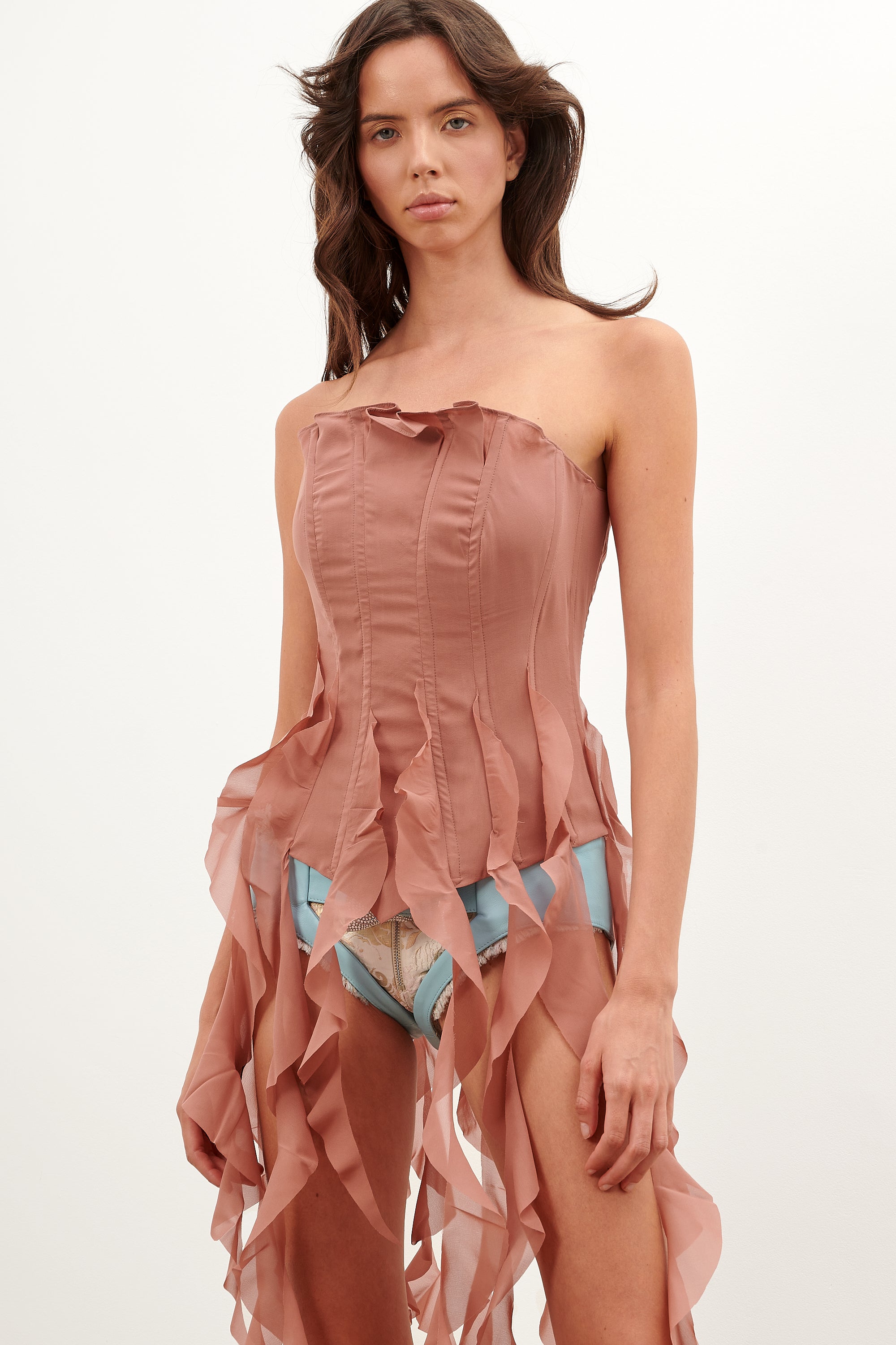 The Calamity Corset showcased on the SS23 runway. Crafted in London in delicate silk chiffon, this luxurious ethereal corset features cascading drapes ruffles, silicone boning, that suction you in all the right places, highlighting your natural curves.
