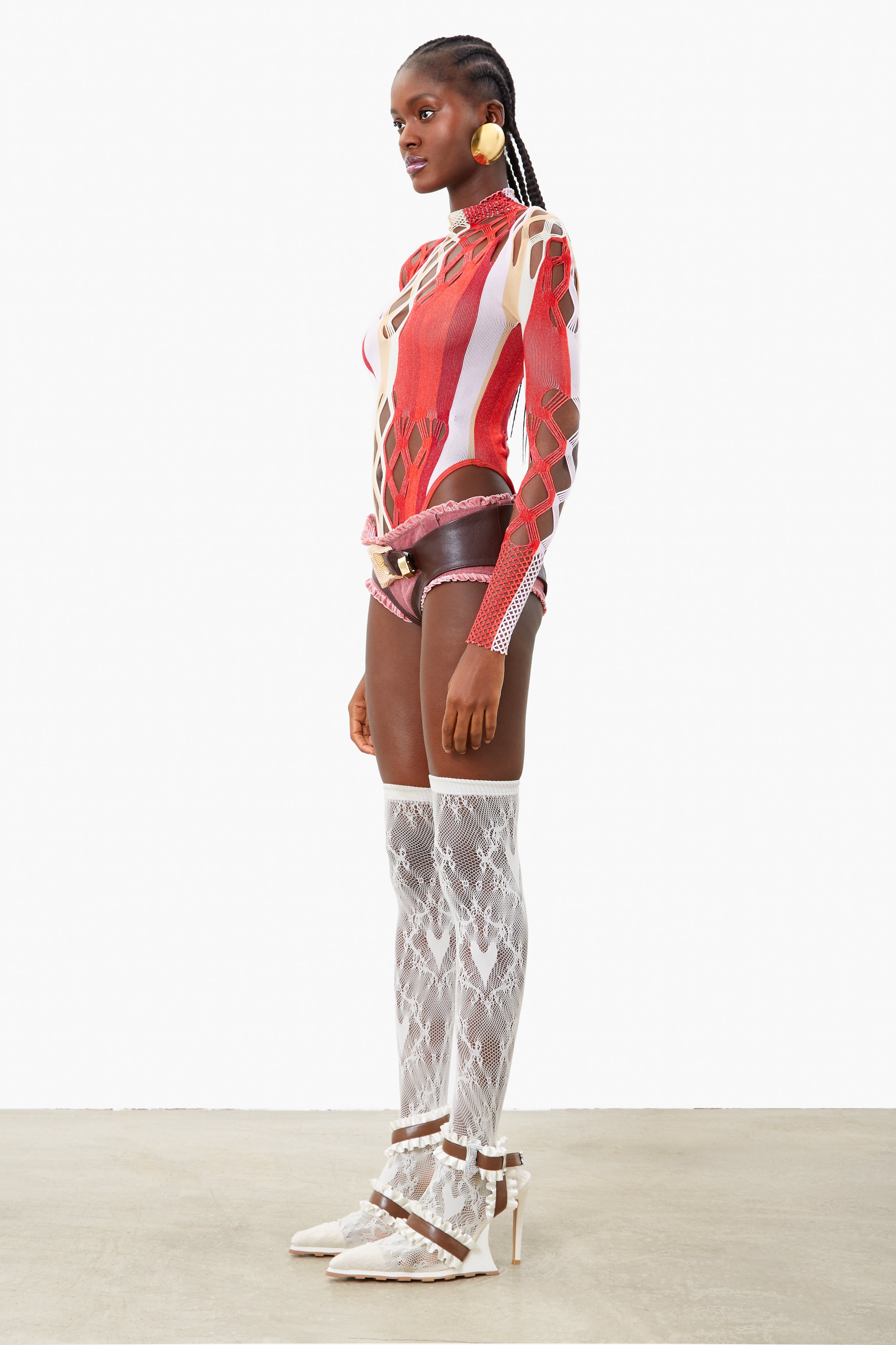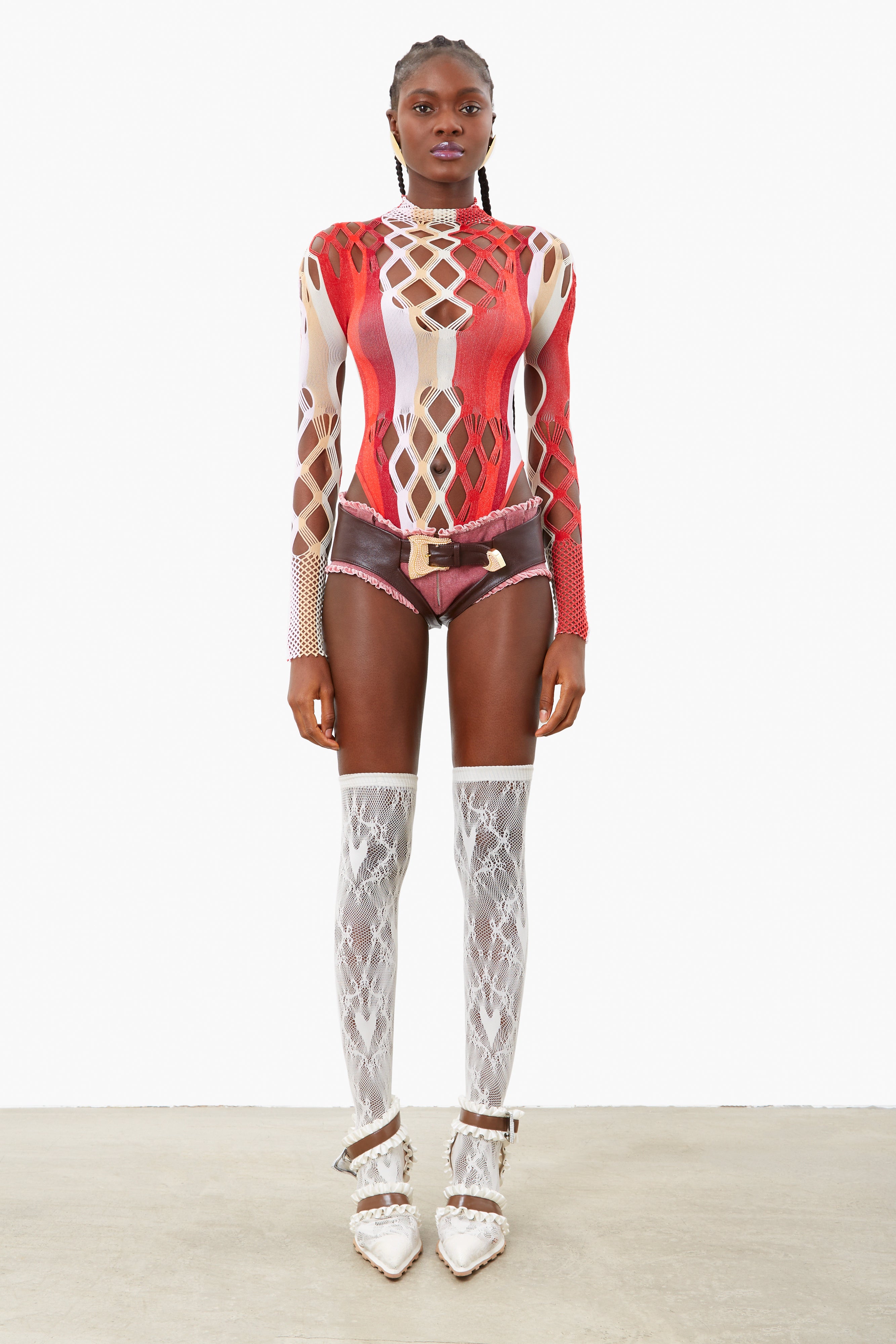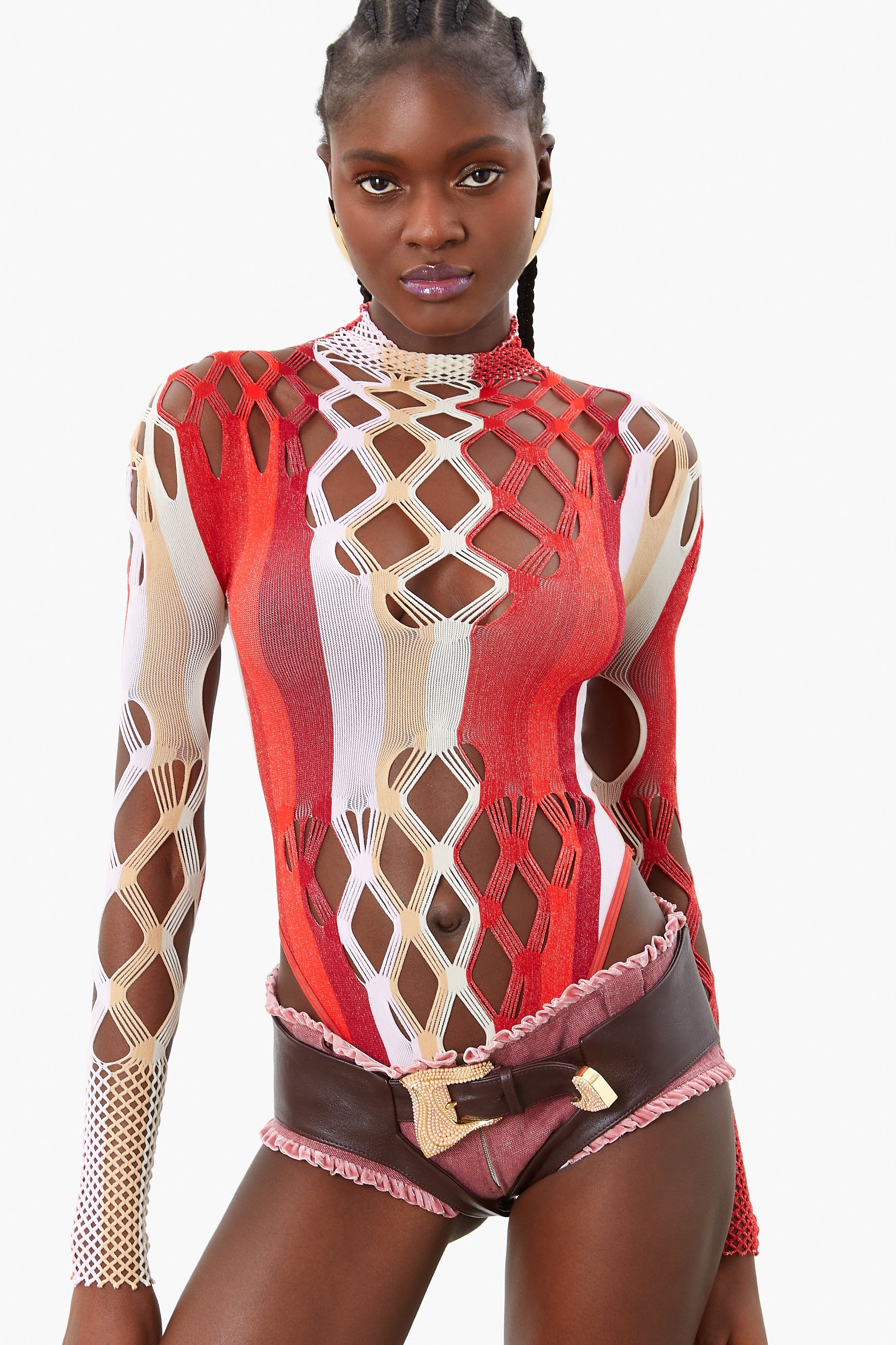 The Amphitrite Bodysuit is brand new for AW23. Featuring our newly developed semi sheer shapewear, hand dyed yarns that blend together in Oyster and Burgundy stripe and our infamous diamond cut open weave lacing, contouring every body to perfection.