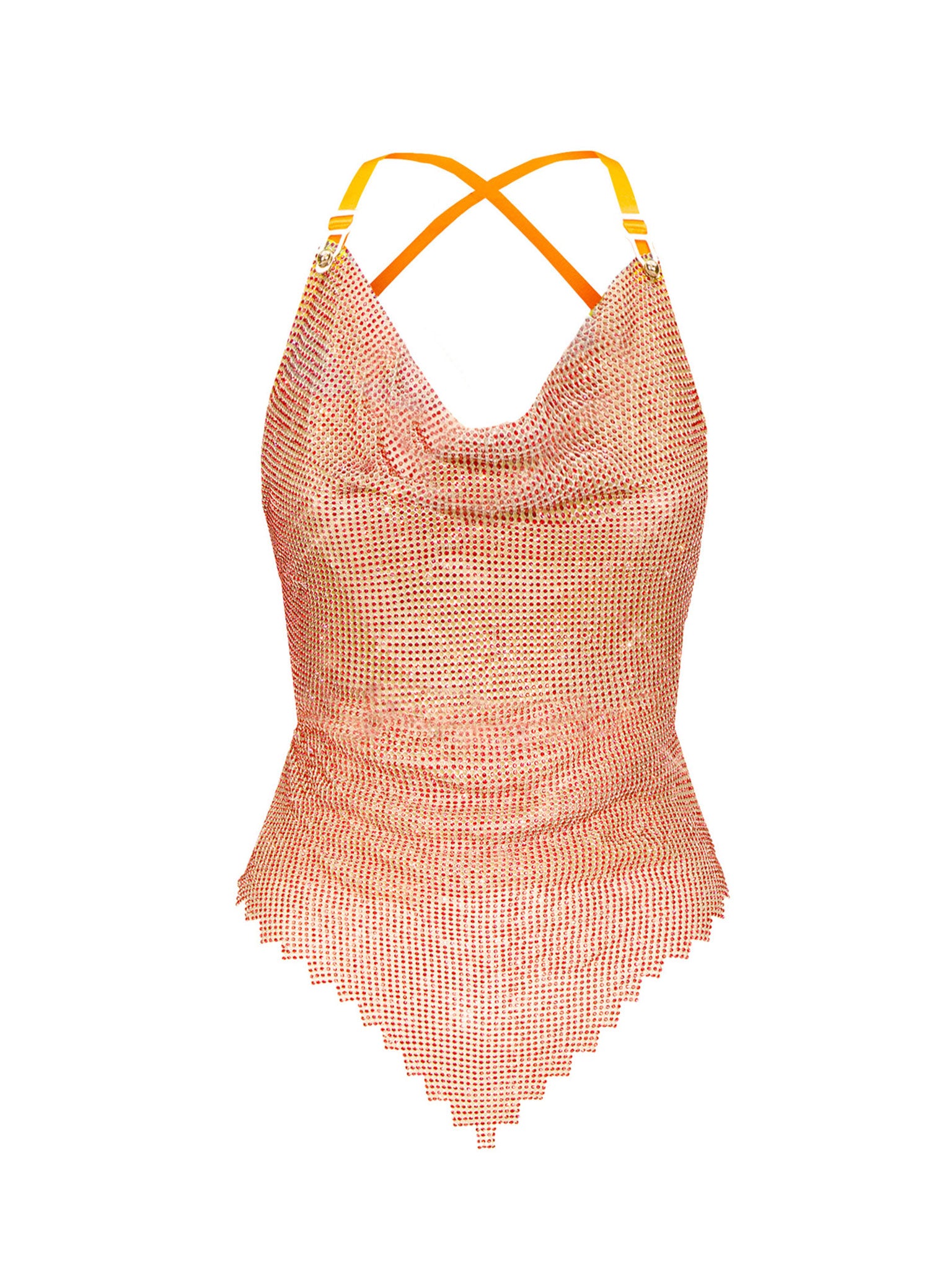 The Beyan Top is brand new for SS22 in a limited edition color way - This beautiful chainmail comes in 'Aperol Spritz' and 'Mojito' with tangerine and lilac elasticated bra straps and 14k Gold hardware fastens with logo engraved. Handmade in London with each sheet of chainmail cut, linked and sewn together by hand to achieve the perfect slink.