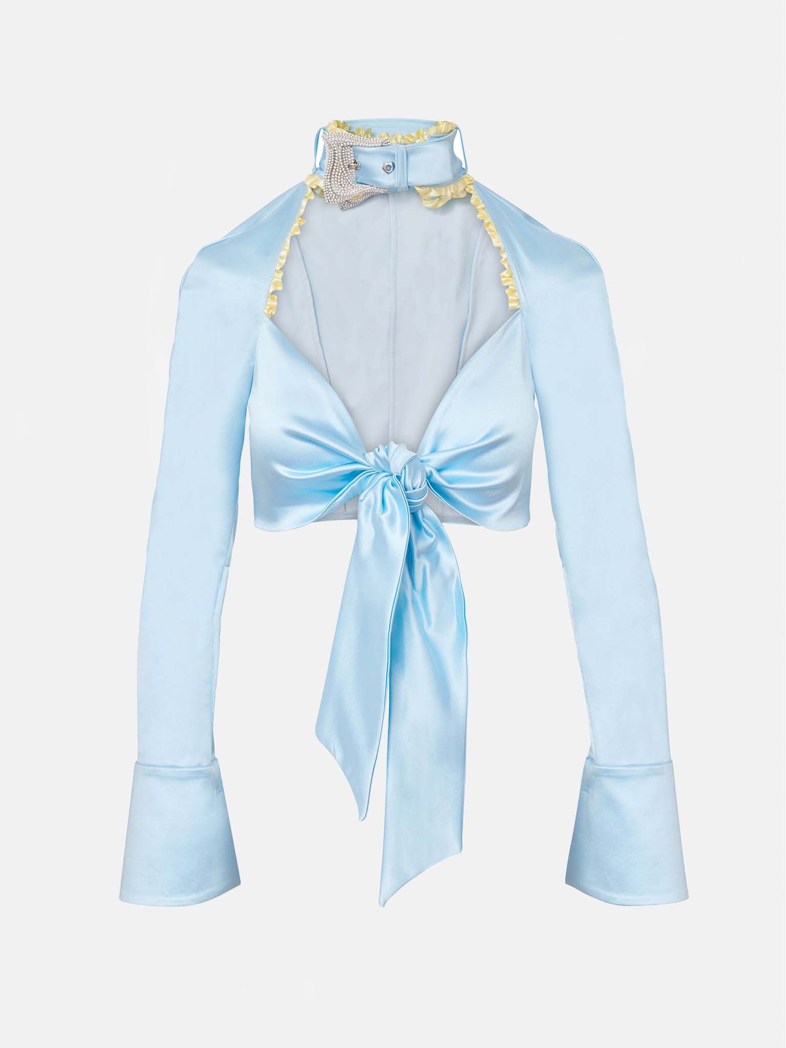The Siren Top is brand new for AW23, as seen on POSTER GIRL JT @thegirljt. Handcrafted in London in beautiful high shine duchess satin, this plunging top features pastel yellow frill detailing, a tie centre and our infamous custom buckle secured at the neck, updated with this seasons pearls. Pair with the Kracken Skirt for the full baby blue look. High shine duchess satin
