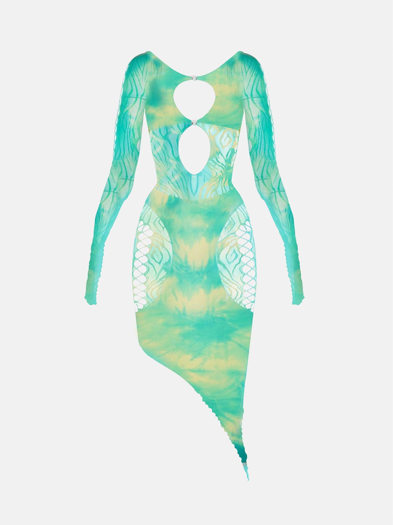 POSTER GIRL's iconic innovative seamless shapewear features 'psychedelic swirl lace'. Cutout crystal heart embellished details and asymmetric lettuce hemline makes this control dress a real head-turner. The brand logo is woven into the lower back and softly spun yarns makes for maximum comfort.