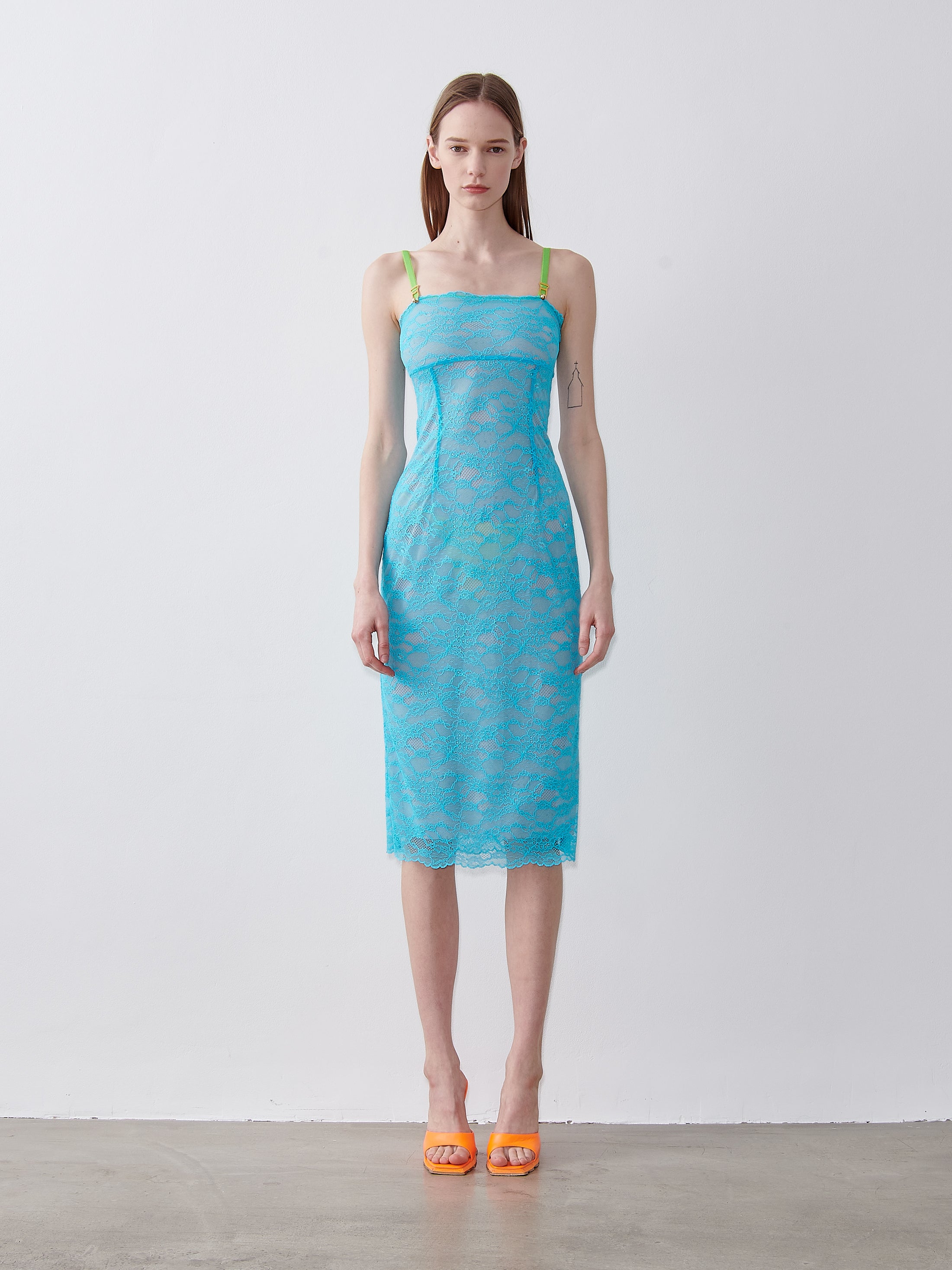 This midi dress allows you to take the allure of lingerie beyond the bedroom - it has a slimming slip silhouette with delicate lace. Gold plated hardware features adjustable bra straps and delicate lace scallop edging.