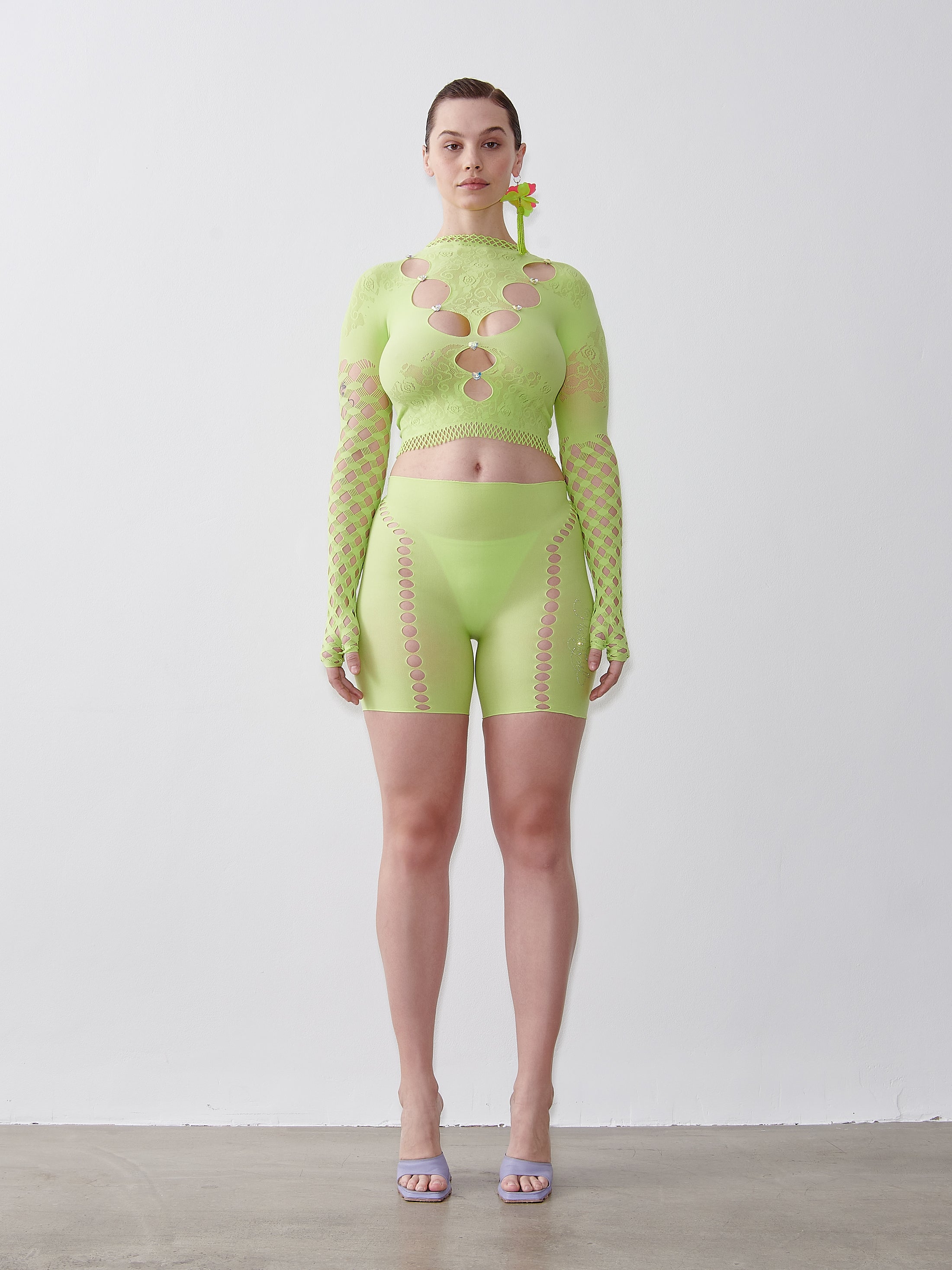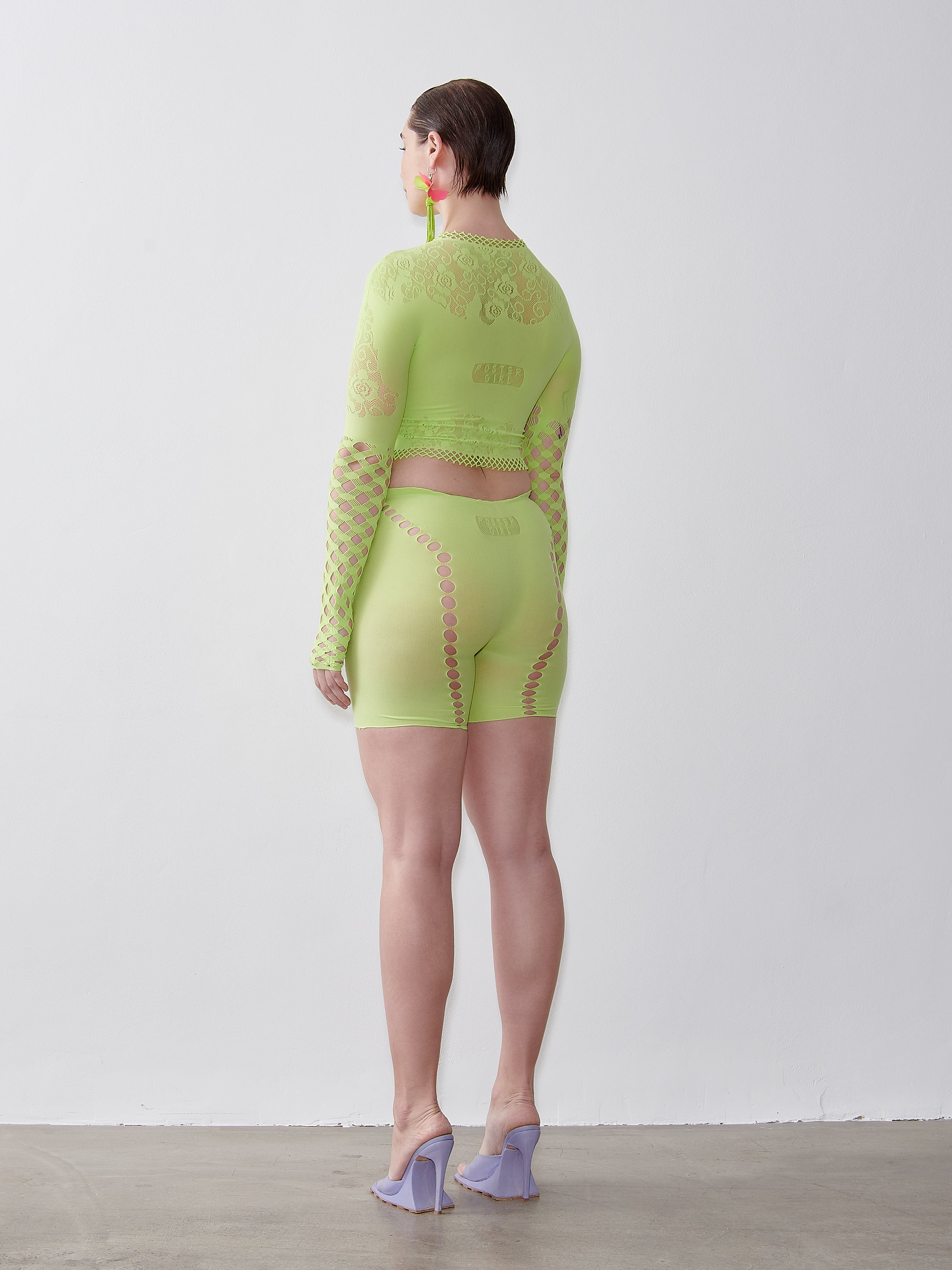 POSTER GIRL's innovative fishnet biker shorts feature cutout details and suction you in all the right places. The brand logo is stamped into the lower back and softly spun yarns make for maximum comfort.