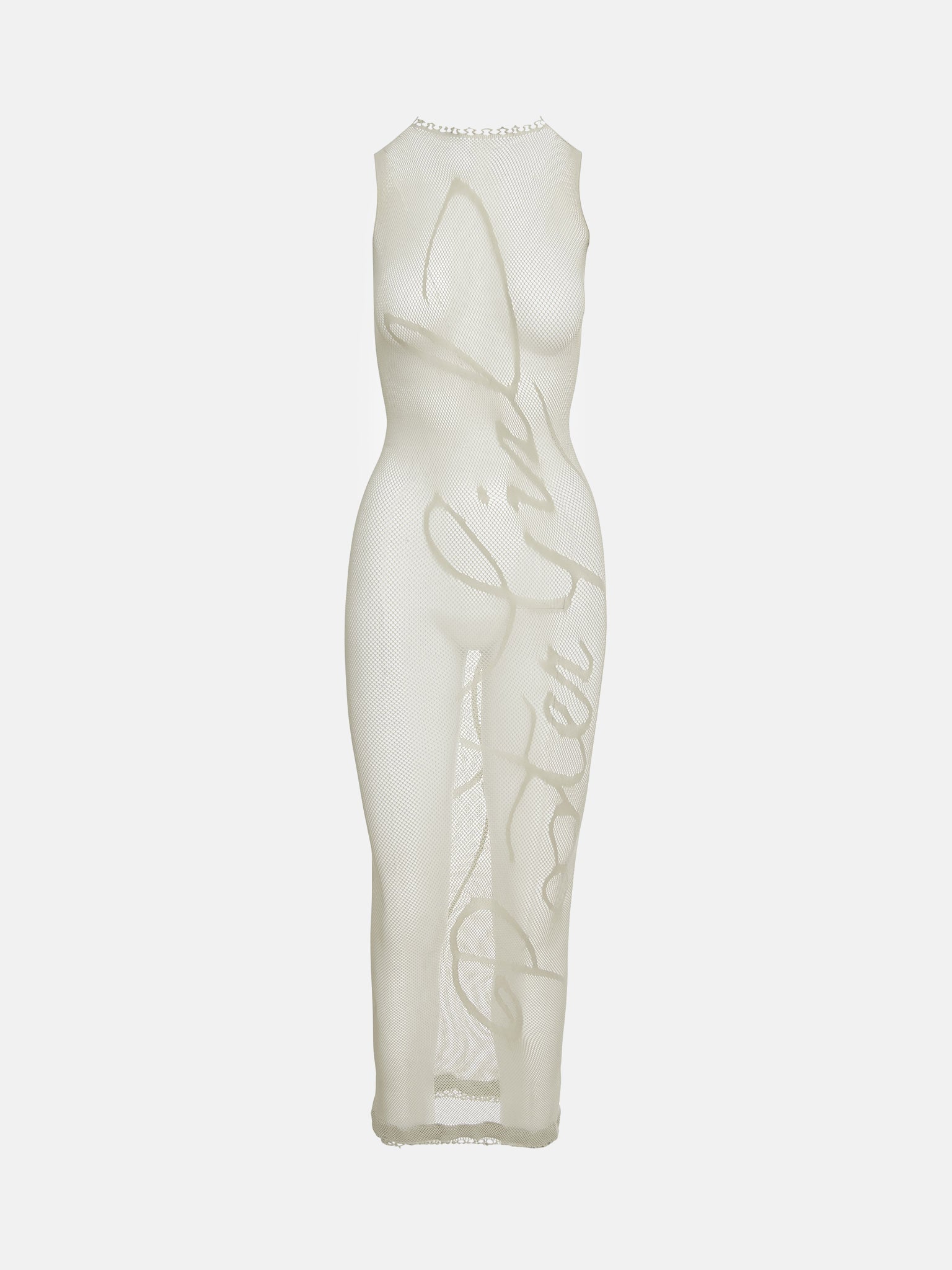 Say 'Aloha' to the brand new midi dress for SS22. POSTER GIRL's innovative new fishnet shapewear features superfine intricate cut weave baring the brands logo front and back. Wear barefoot over your bikini at the tiki bar or go heavy with the accessories and throw on some heels for a real head turner.