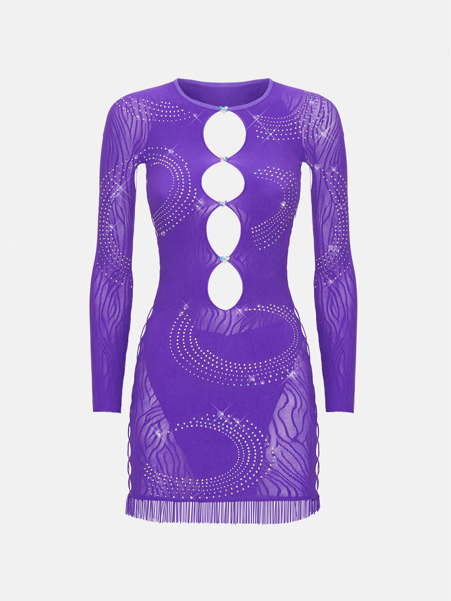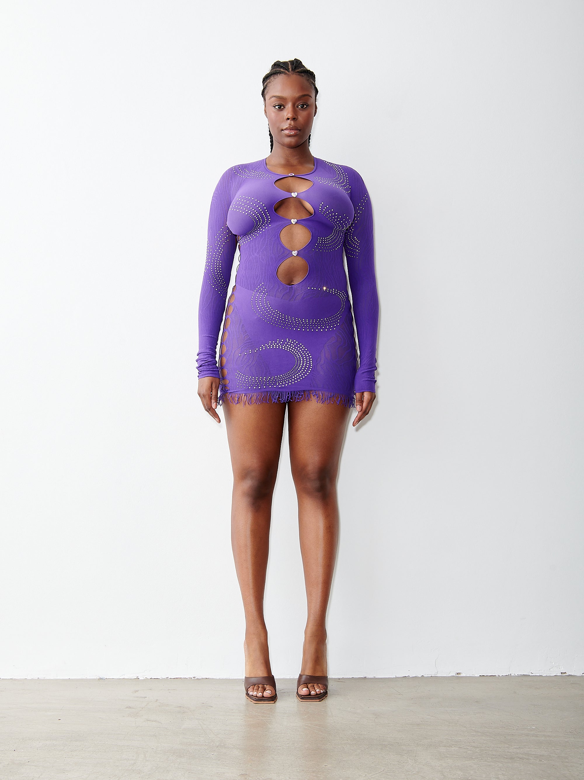 The infamous long sleeved Miranda Dress in Twilight features our iconic psychedelic swirl lace, heart cut out detailing and iridescent swarm or rhinestones. POSTER GIRL's brand logo is always stamped into the lower back of each garment, confirming its authenticity.