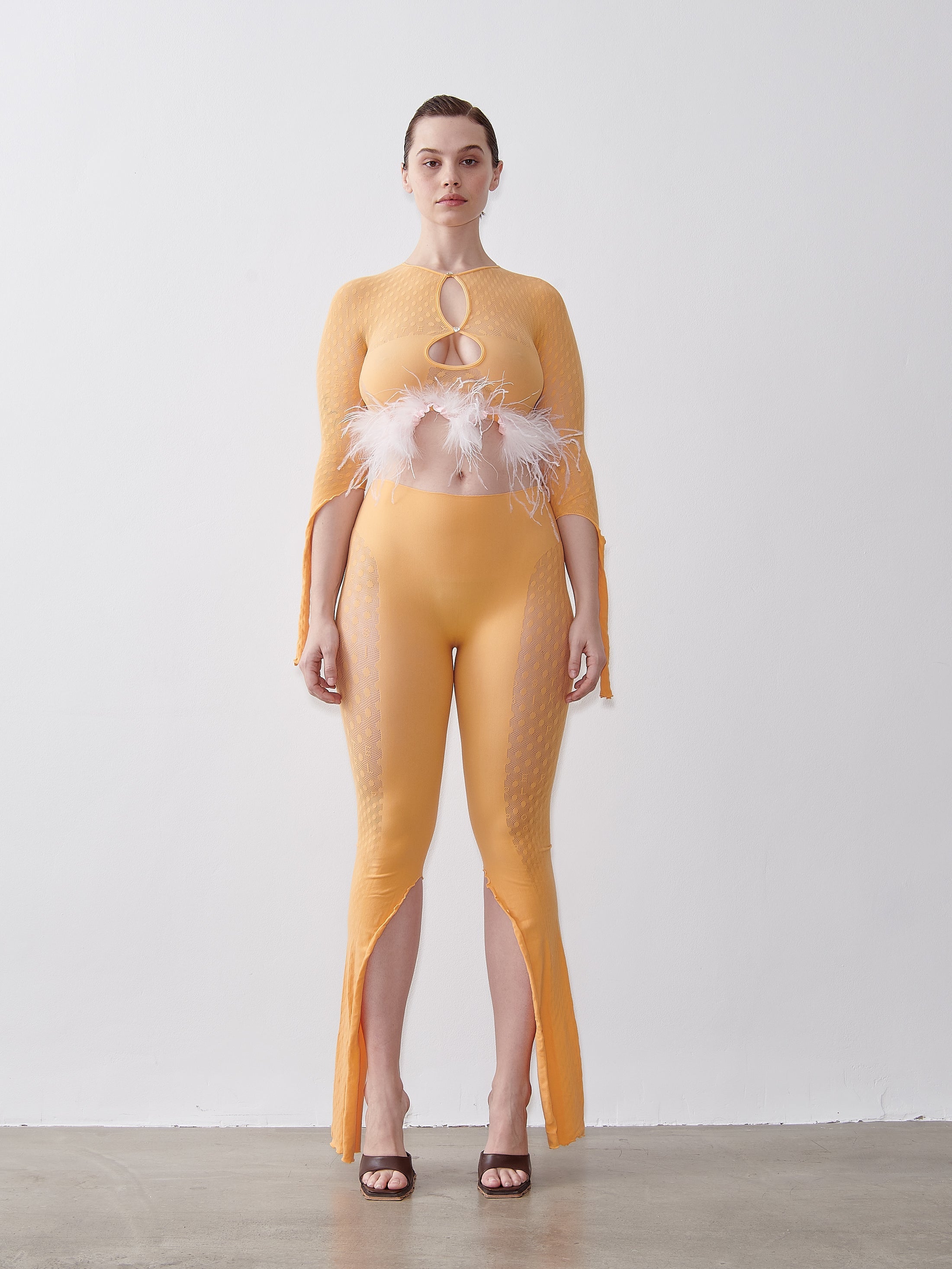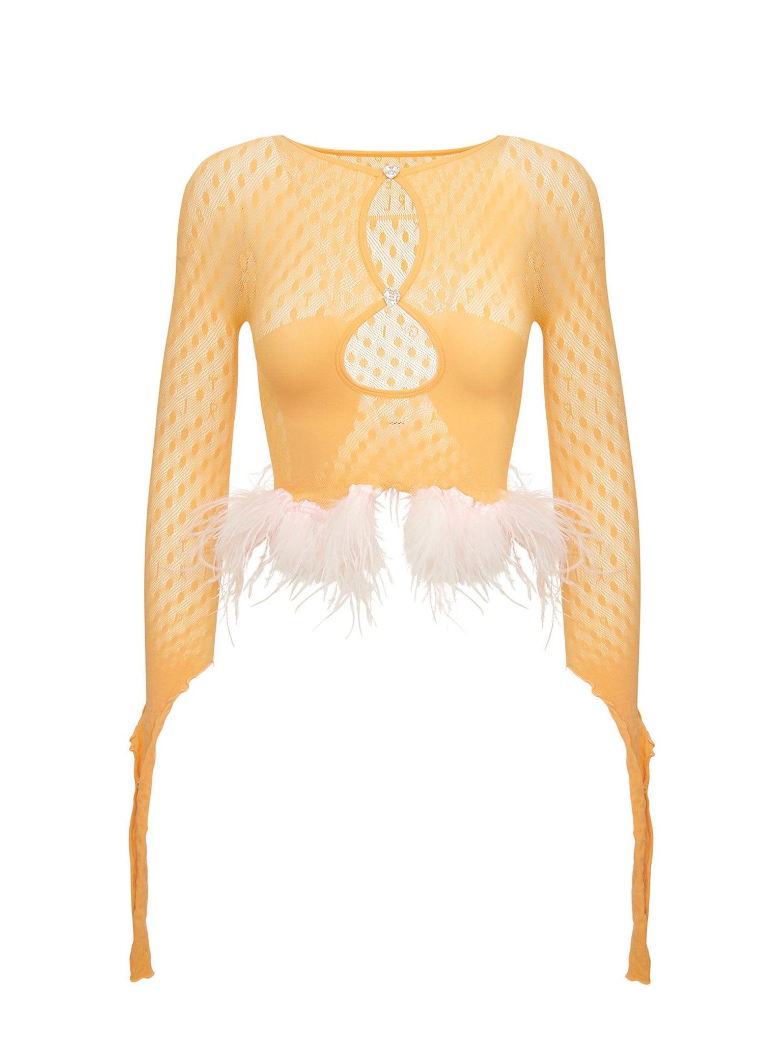 The feather Mira top is an exclusive from AW21, POSTER GIRL's innovative fishnet shapewear features 'logo polka dot lace' and suctions you in all the right places. Cutout crystal heart embellished details in the open-work cut out front. The brand logo is stamped into the back neck and softly spun yarns makes for maximum comfort. Featuring our signature ostrich and marabou feather blend.