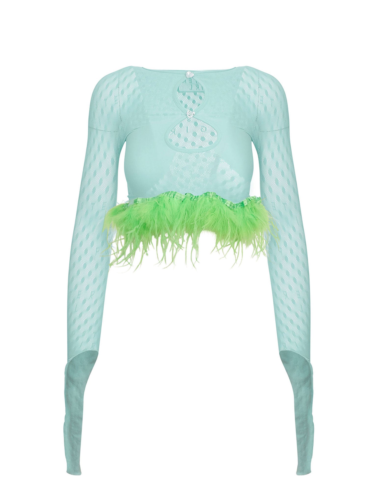 The feather Mira top is an exclusive from AW21, POSTER GIRL's innovative fishnet shapewear features 'logo polka dot lace' and suctions you in all the right places. Cutout crystal heart embellished details in the open-work cut out front. The brand logo is stamped into the back neck and softly spun yarns makes for maximum comfort. Featuring our signature ostrich and marabou feather blend.