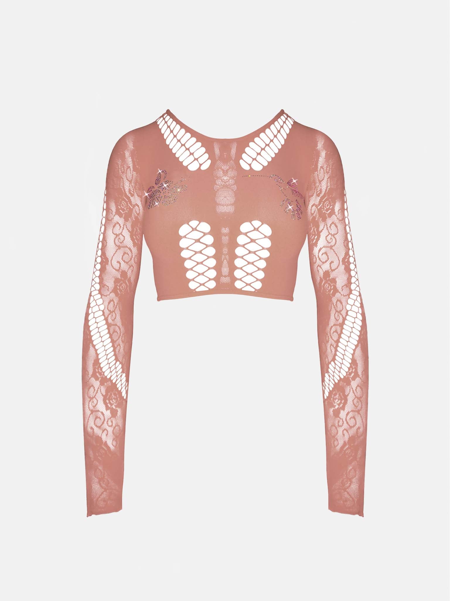 The Harlow top is crafted for a close, figure-hugging fit with a multitude of signature skin-baring cutouts. Rhinestones take the form of a hibiscus flower and hummingbird, evoking high-octane glamour to stunning effect.