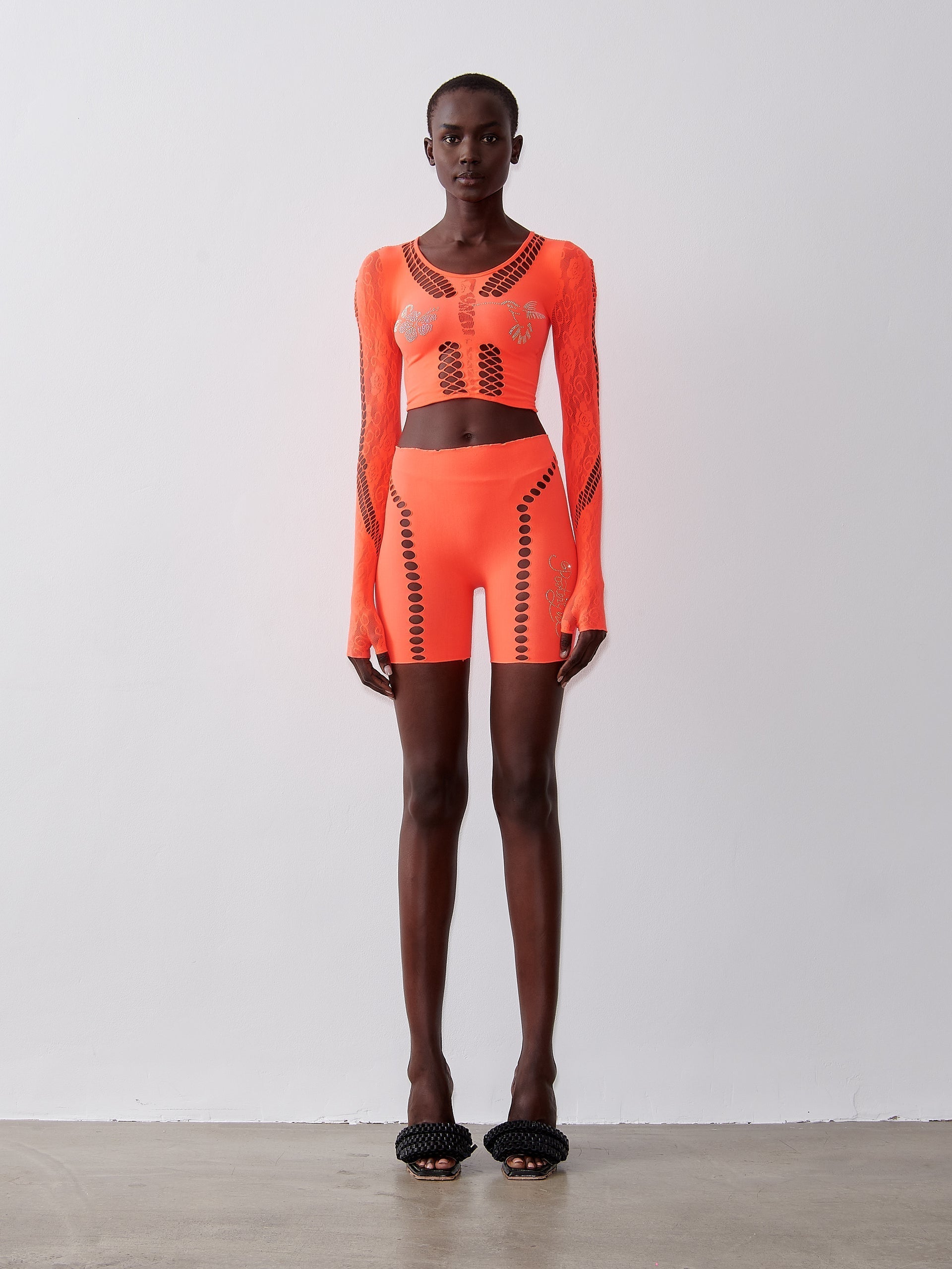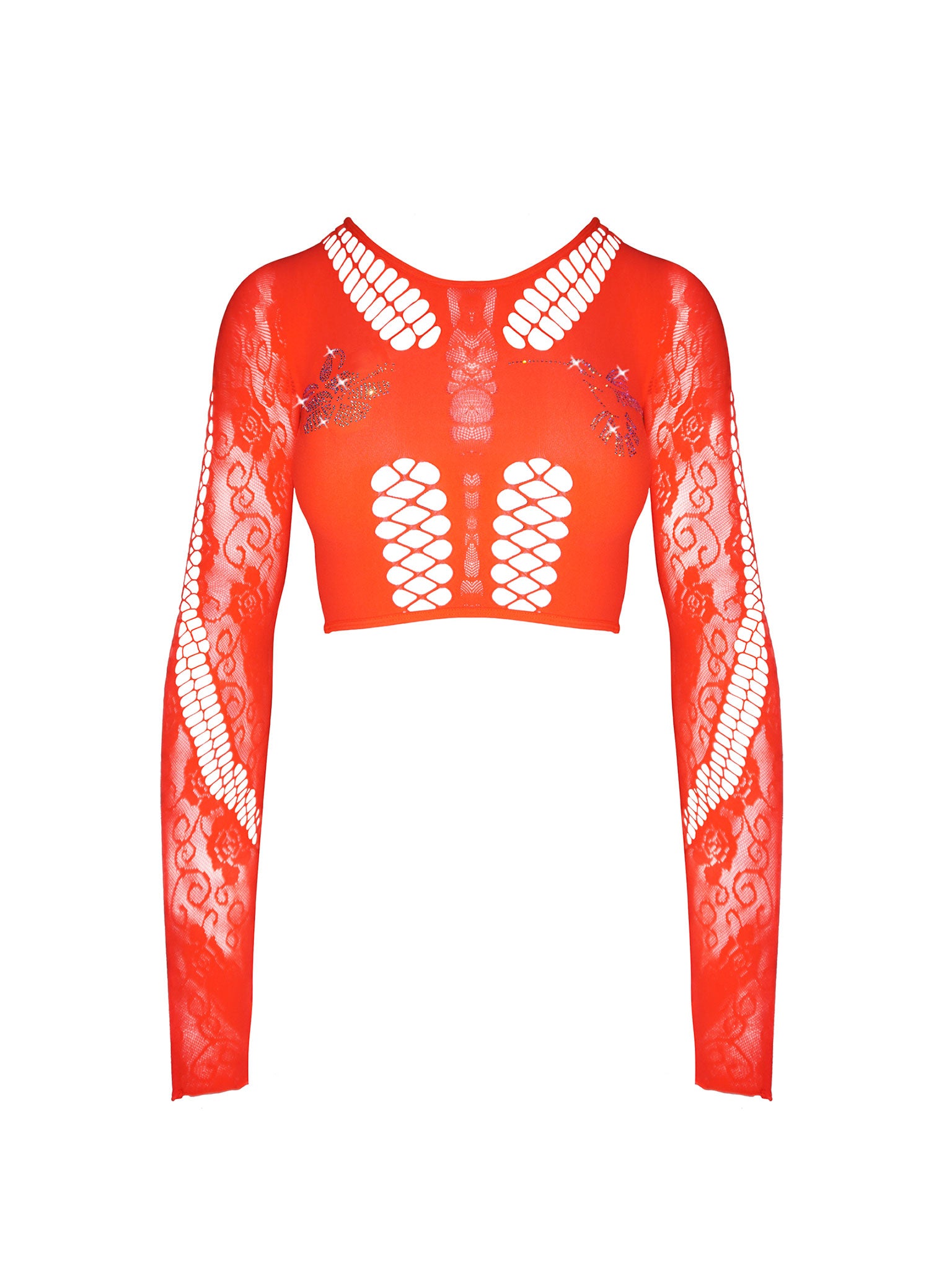 The Harlow top is crafted for a close, figure-hugging fit with a multitude of signature skin-baring cutouts. Rhinestones take the form of a hibiscus flower and hummingbird, evoking high-octane glamour to stunning effect.