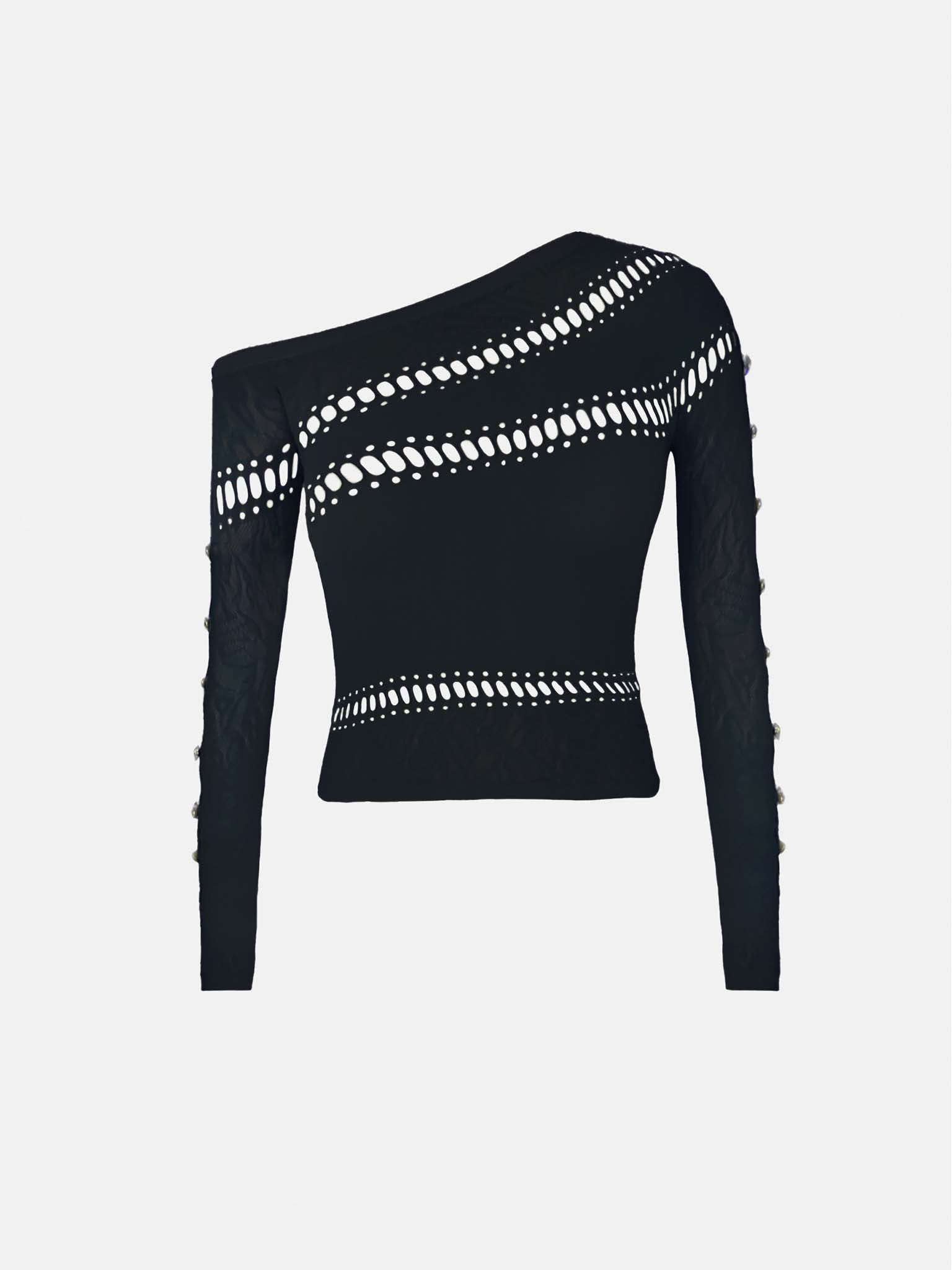 Our new IVY top in Black is uniquely designed with asymmetric cut out details and contrasting textures. This top features an off-shoulder detail and diamante heart buttons along the sleeves. Match with the Ivy legging for the ultimate look.