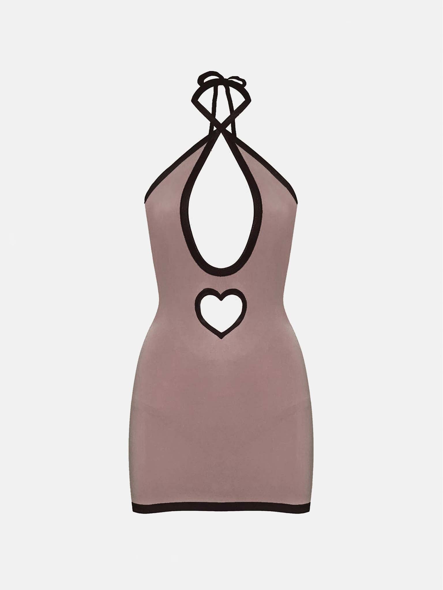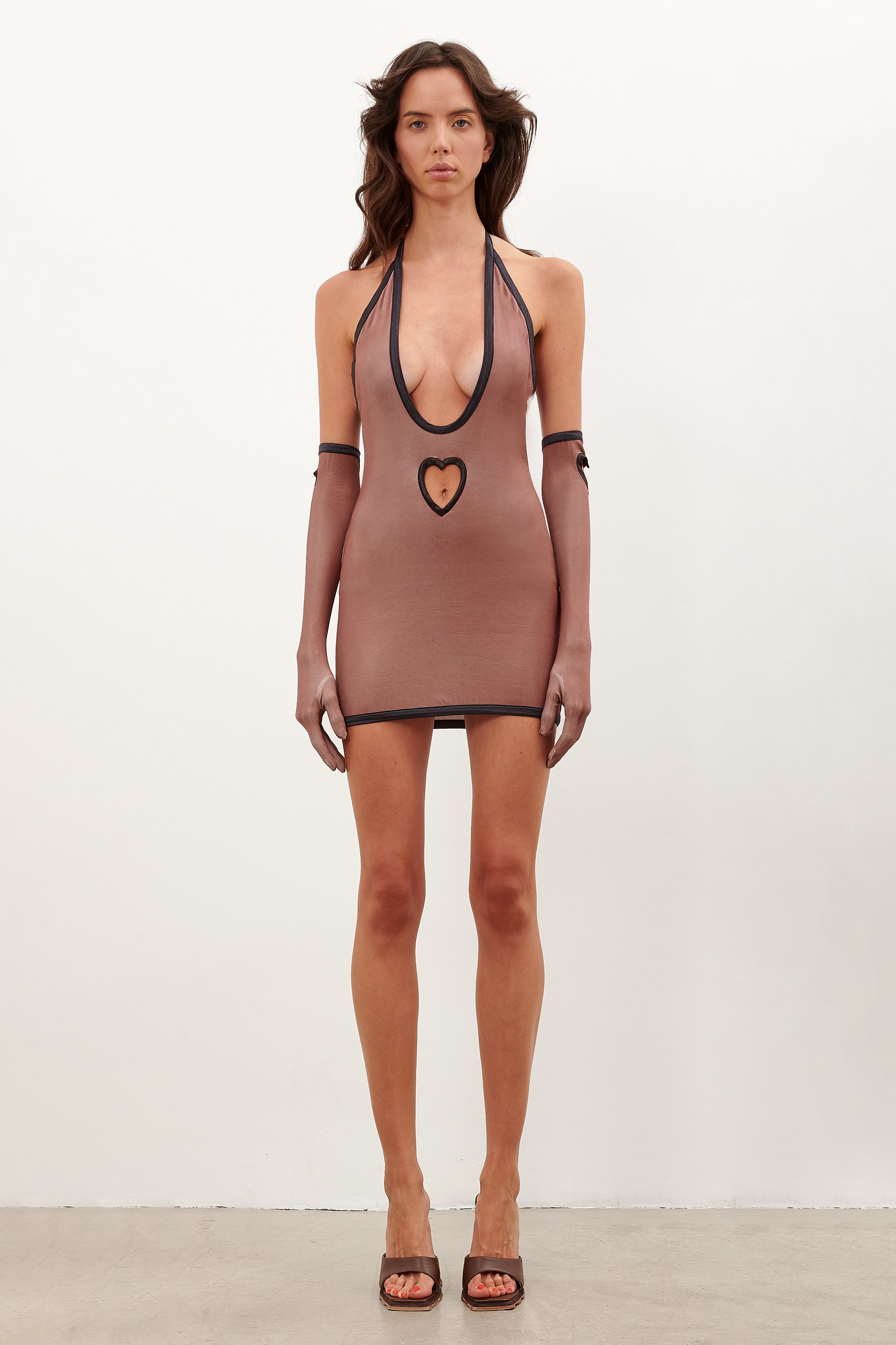 Introducing The Kylie Dress, custom made for Kylie Jenner for Valentine's Day, in a brand new nude brown and black trim detail. The iconic mini dress is based on our best selling Bree Dress with the added appeal of built in knickers and multi-way wear straps. The Kylie Dress features an adorable heart cut-out at front and long back tie. Created in double layered luxurious slinky jersey with a wide shiny edging to frame your figure.