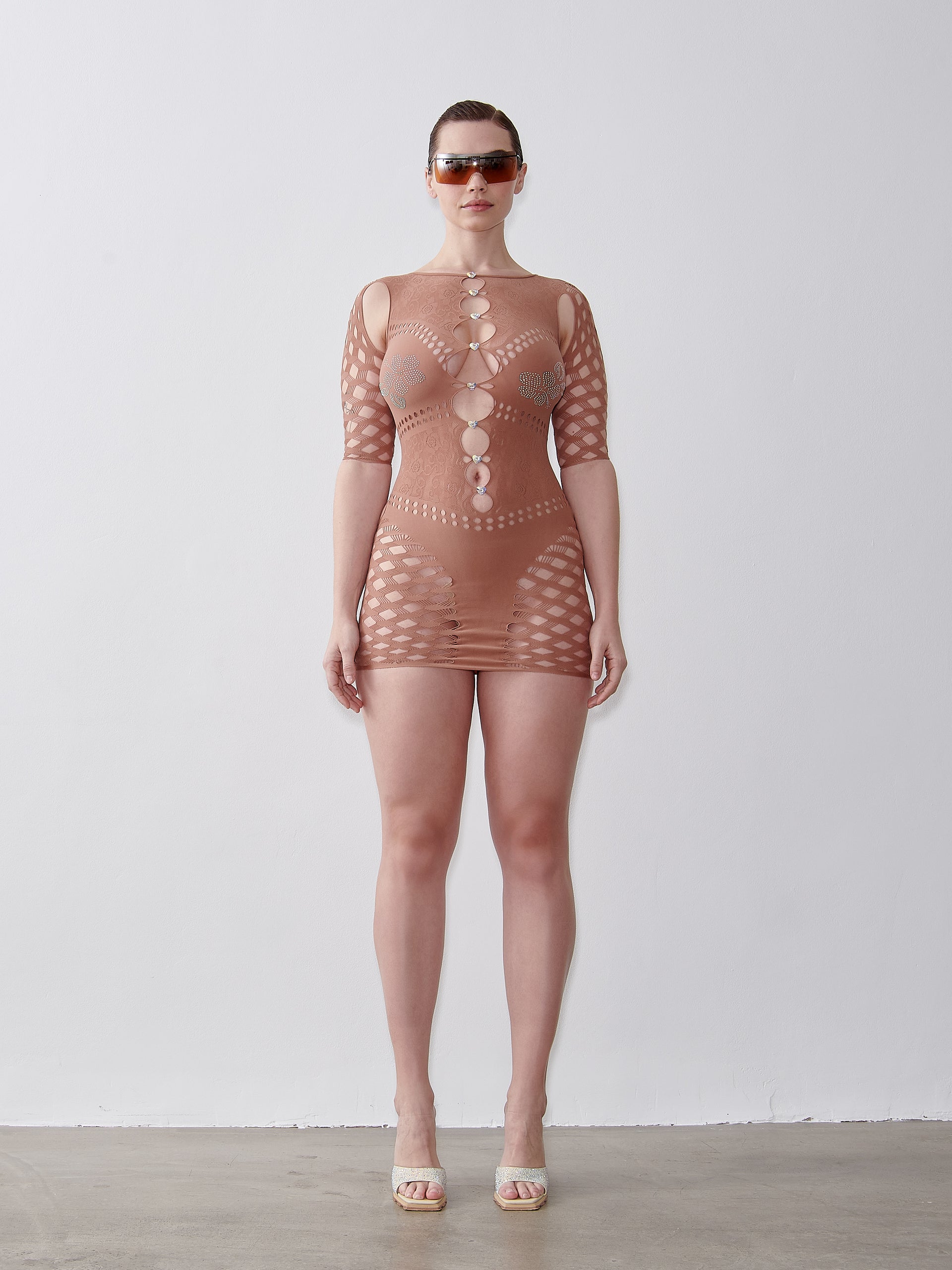 A true POSTER GIRL piece is never complete without an array of shimmering heart crystals. Holographic hot fix takes the form of hawaiian hibiscus flowers strategically placed on each breast for cheekiness. The Lola Dress has a hat-trick of fabrication techniques to conceal and reveal. Opaque, floral lace and lattice lace; she's a showstopper!