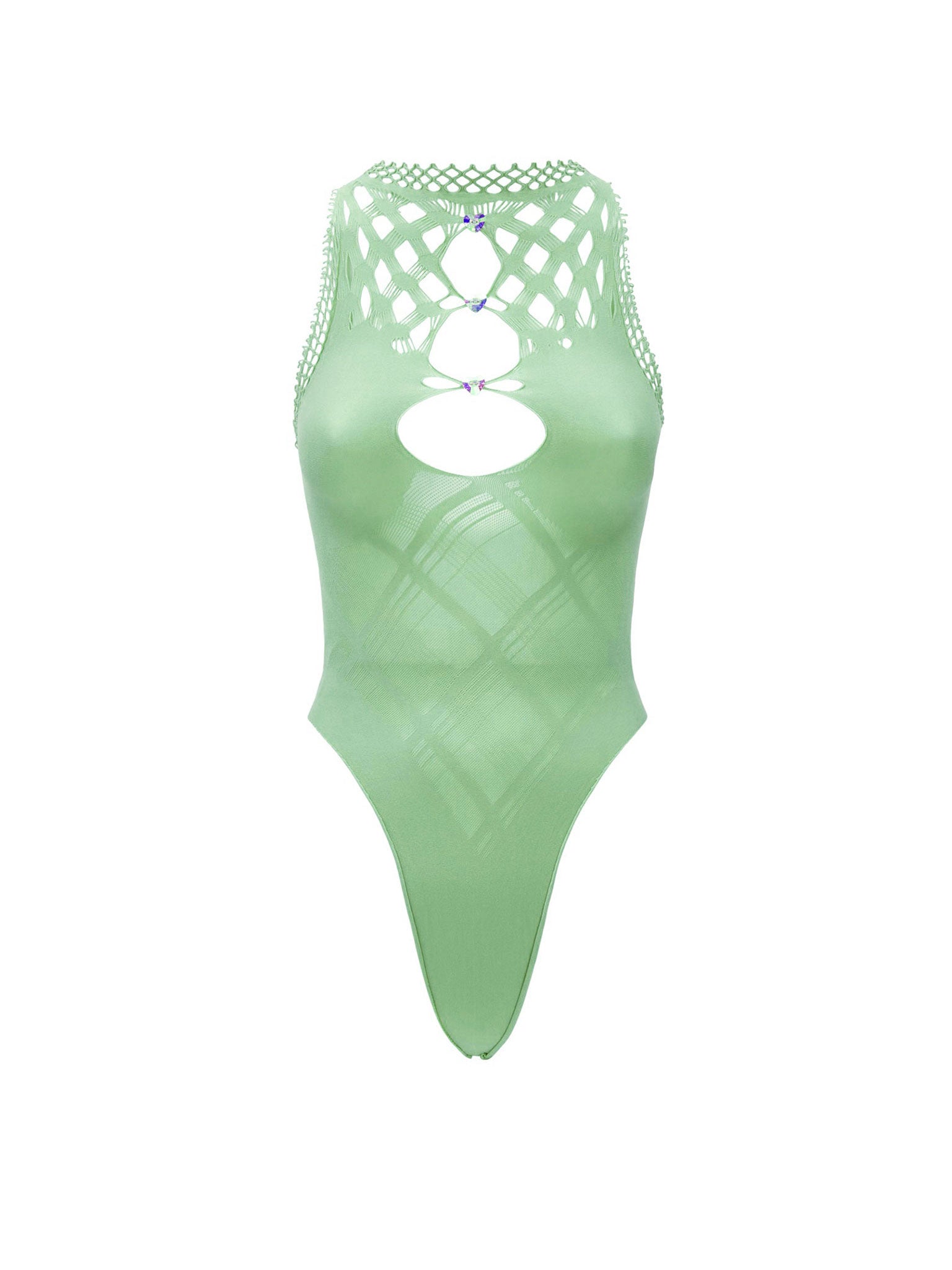 The Lulu Bodysuit will spice up any wardrobe. Crafted from the labels signature body-skimming fishnet shapewear in an array of lace techniques. Cut out heart crystal embellishments make this little number the perfect piece for date night.