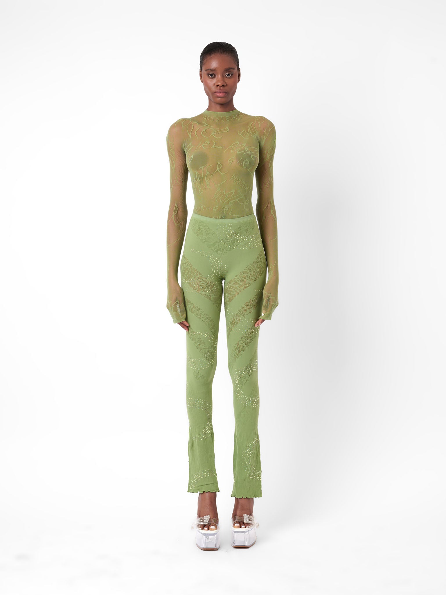 The Maia Pants have been uniquely designed with asymmetrical space panelling and a slim fit through the thighs before falling to flared lettuce hems. These versatile leggings feature contrasting lace swirls and opaque textures and clusters of iridescent rhinestones. Pair with the Georgia Top & Glass Slippers for the complete look.
