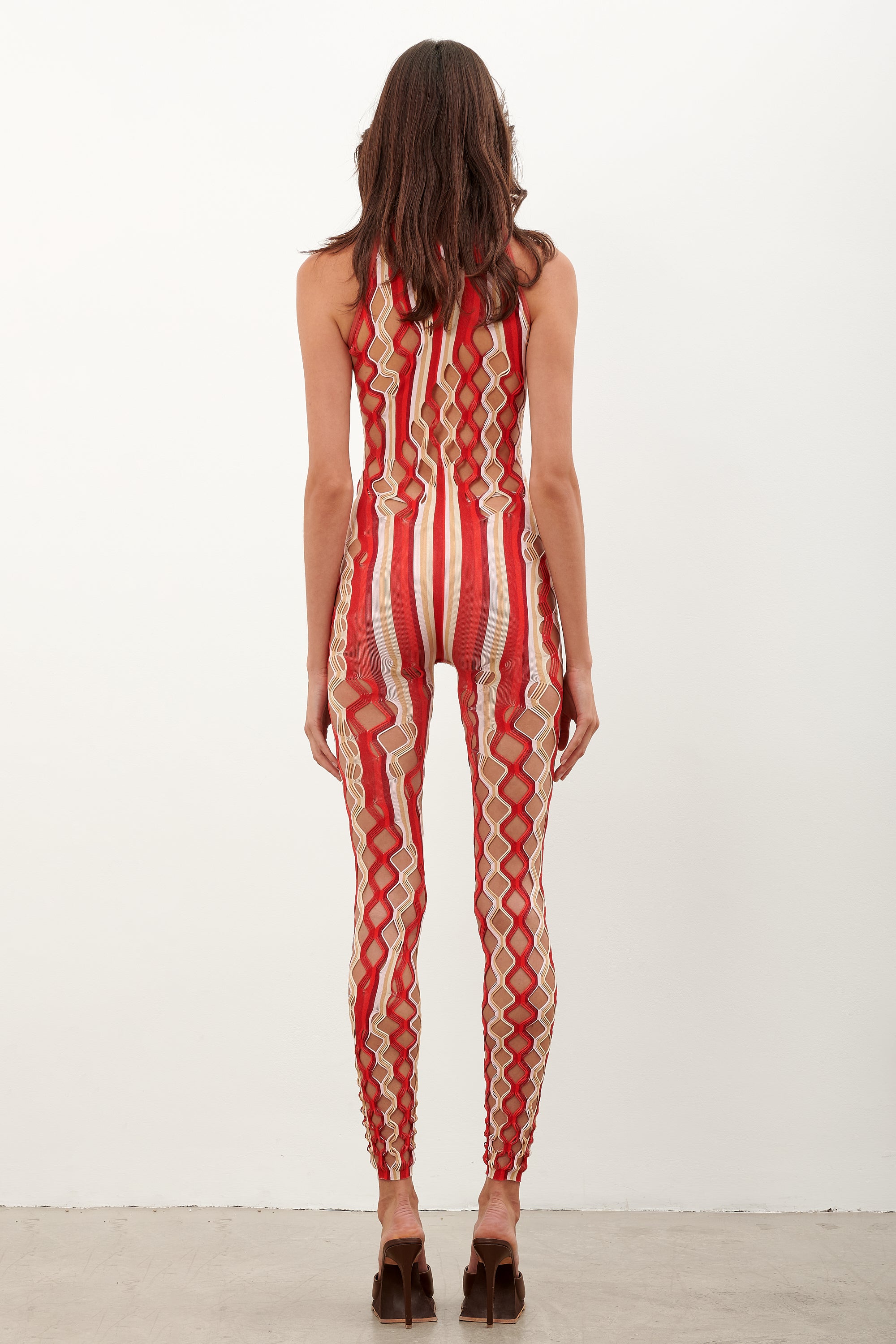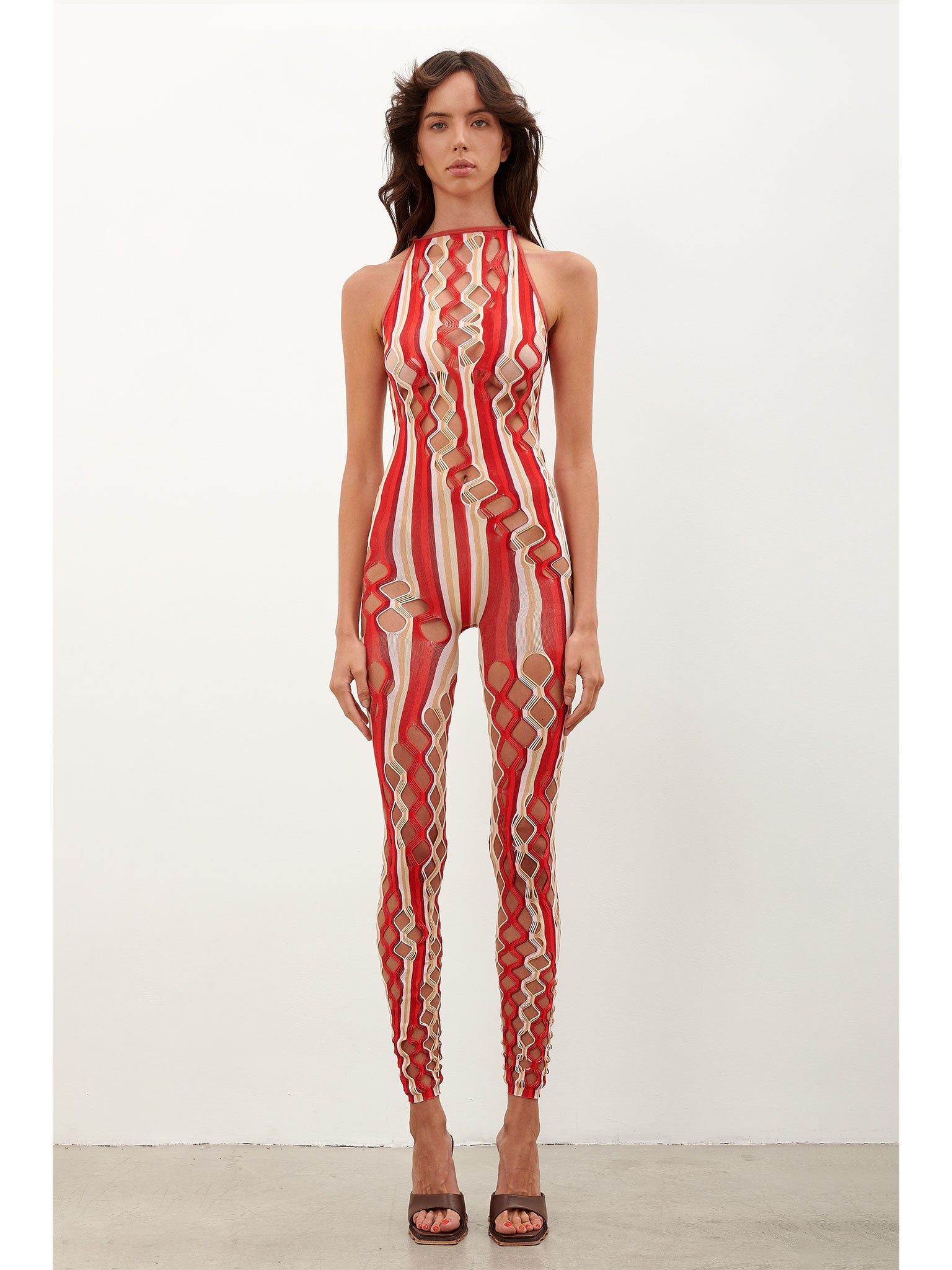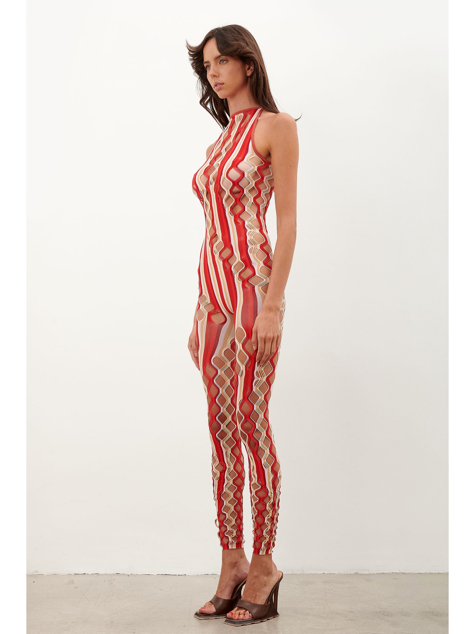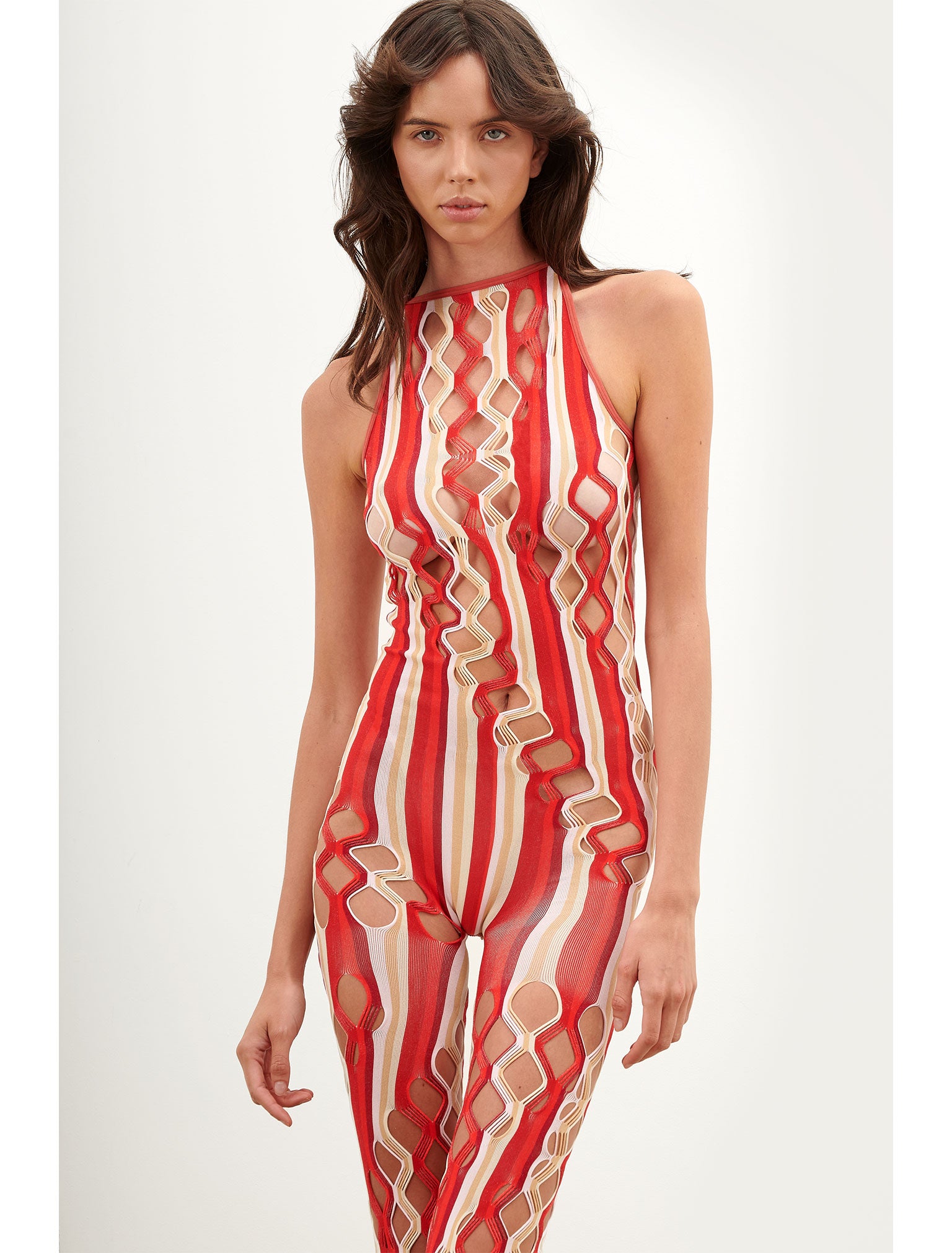 The Reef Jumpsuit is brand new for AW23. Featuring our newly developed semi sheer shapewear, hand dyed yarns that blend together in Oyster and Burgundy stripe and our infamous diamond cut open weave lacing, contouring every body to perfection.