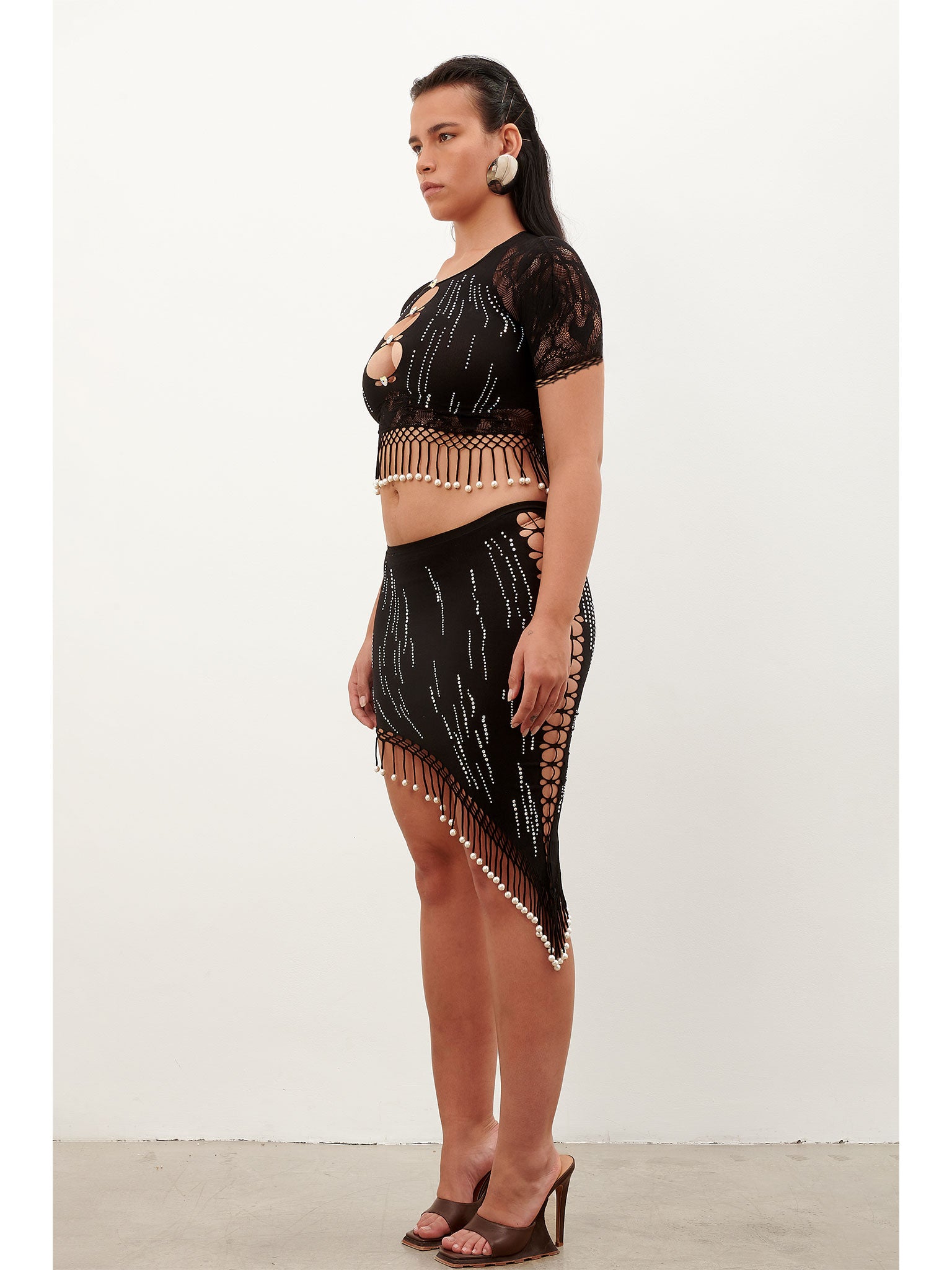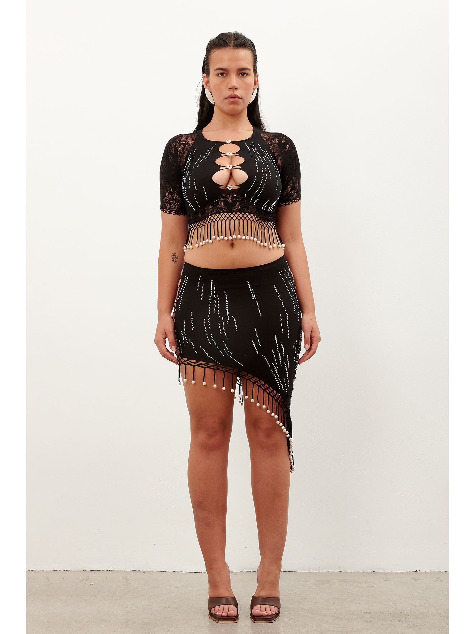 POSTER GIRL's shapewear category is designed to suction you in all the right places, releasing and supporting your natural curves where needed. The Urchin Top is brand new for AW23, inspired by our best selling Miranda Top. This crop top features our brand new hearts & bows intricate lacing, swarms of iridescent rhinestones, and fringing detailing - finished with beaded pearls. As always, our shapewear features our infamous peep hole cut outs with heart iridescent buttons. Available in Black. Always remember, the brand logo is stamped into the lower back of all shapewear designs as POSTER GIRL's mark of authenticity.