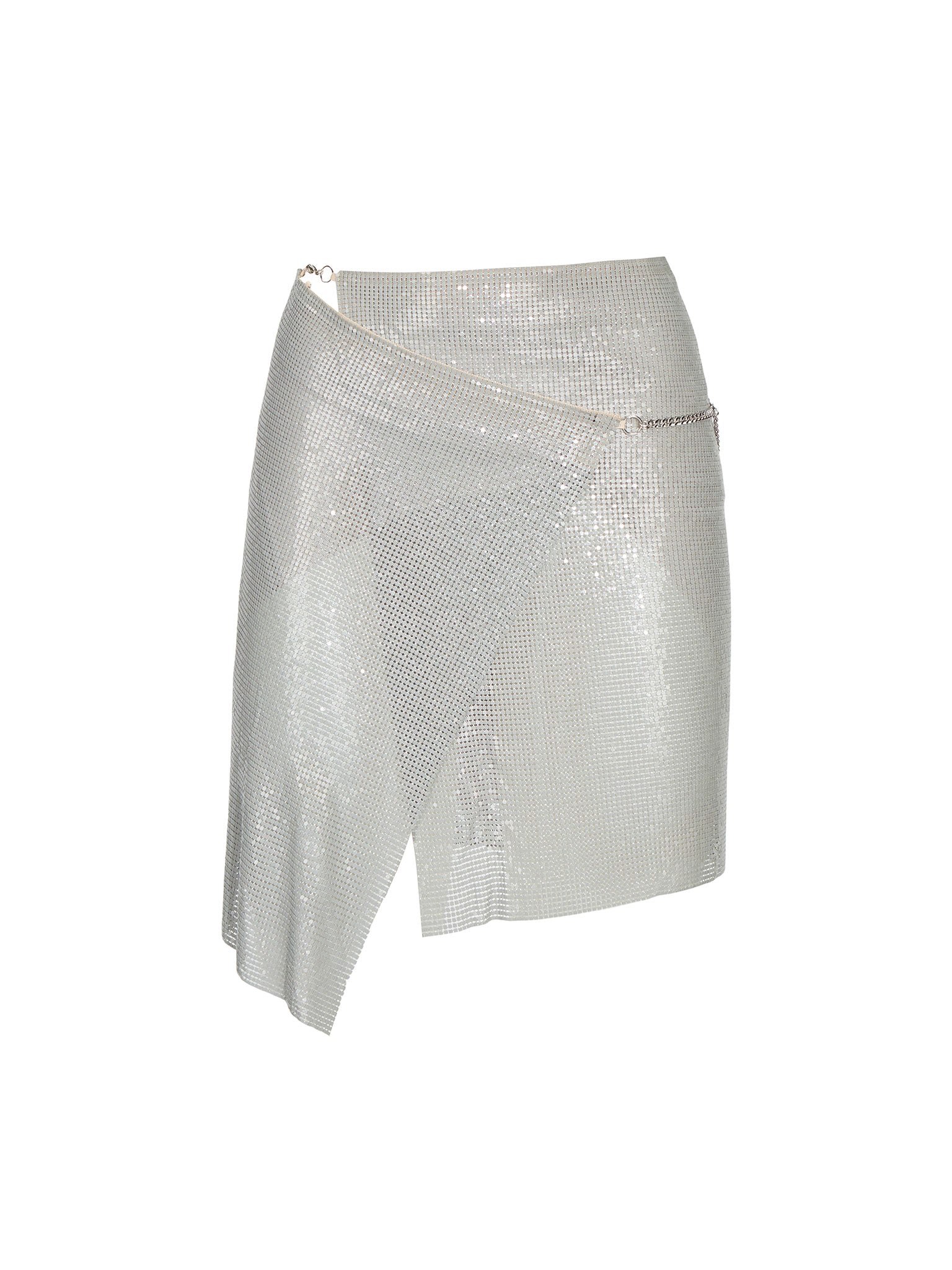 The Winona Wrap Skirt is crafted from our micro metal-mesh and wraps with ease around the waist into an asymmetric, mini-grazing hem.